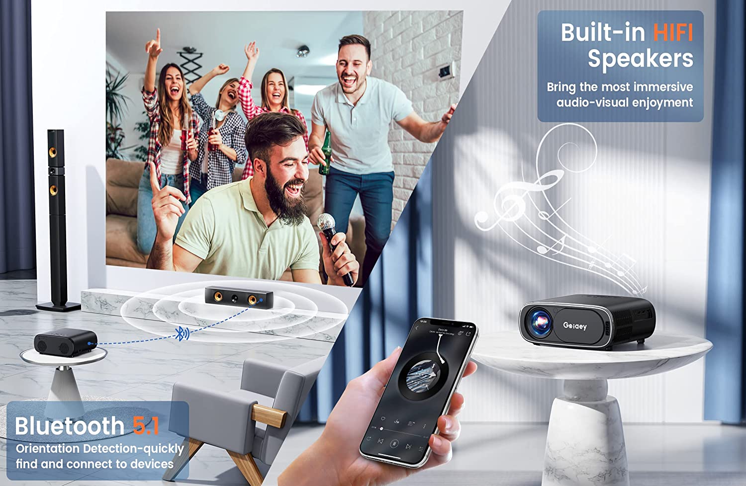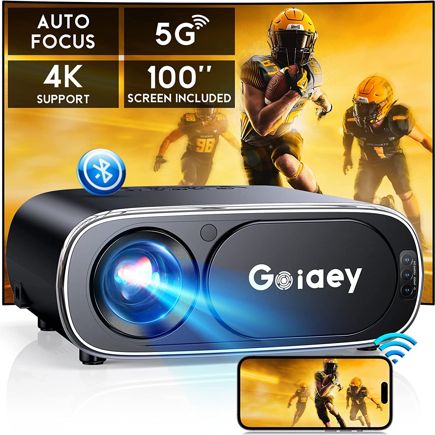 Auto Focus - Projector 5G WiFi Bluetooth with 100'' Screen - Goiaey 480 ANSI 18000L Native 1080P Portable Outdoor Movie Projector 4K Support, Auto 6D Keystone, Video Projector for iOS/Android/TV/PS5