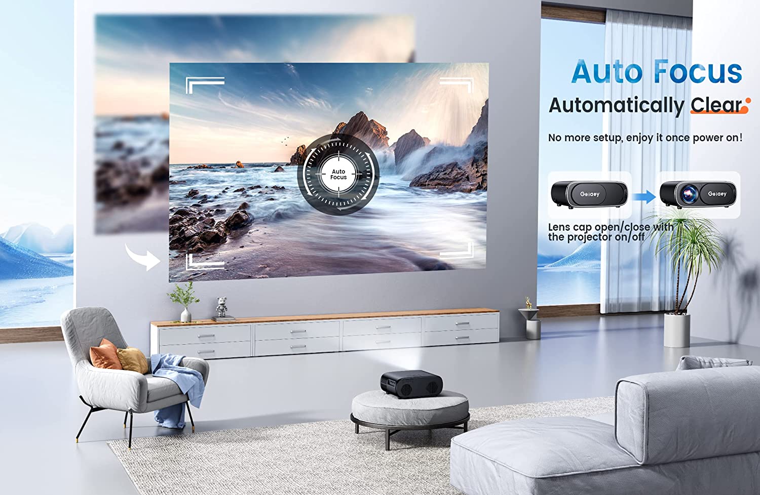 ◎【Auto Focus & Electric Lens Cap & Dustproof】The first auto-focus LCD projector in 2022, GO1 portable projector adopts SLR focusing tech and a built-in AI camera. This smart projector will autofocus clearly in 5s as the power on or being moved. No need to manually adjust the focus or distance repeatedly like other projectors. The lens cap opens/closes with power on/off to protect the lens from dust and scratches, avoiding losing and allowing for easy maintenance, perfect for ceiling mounted!
