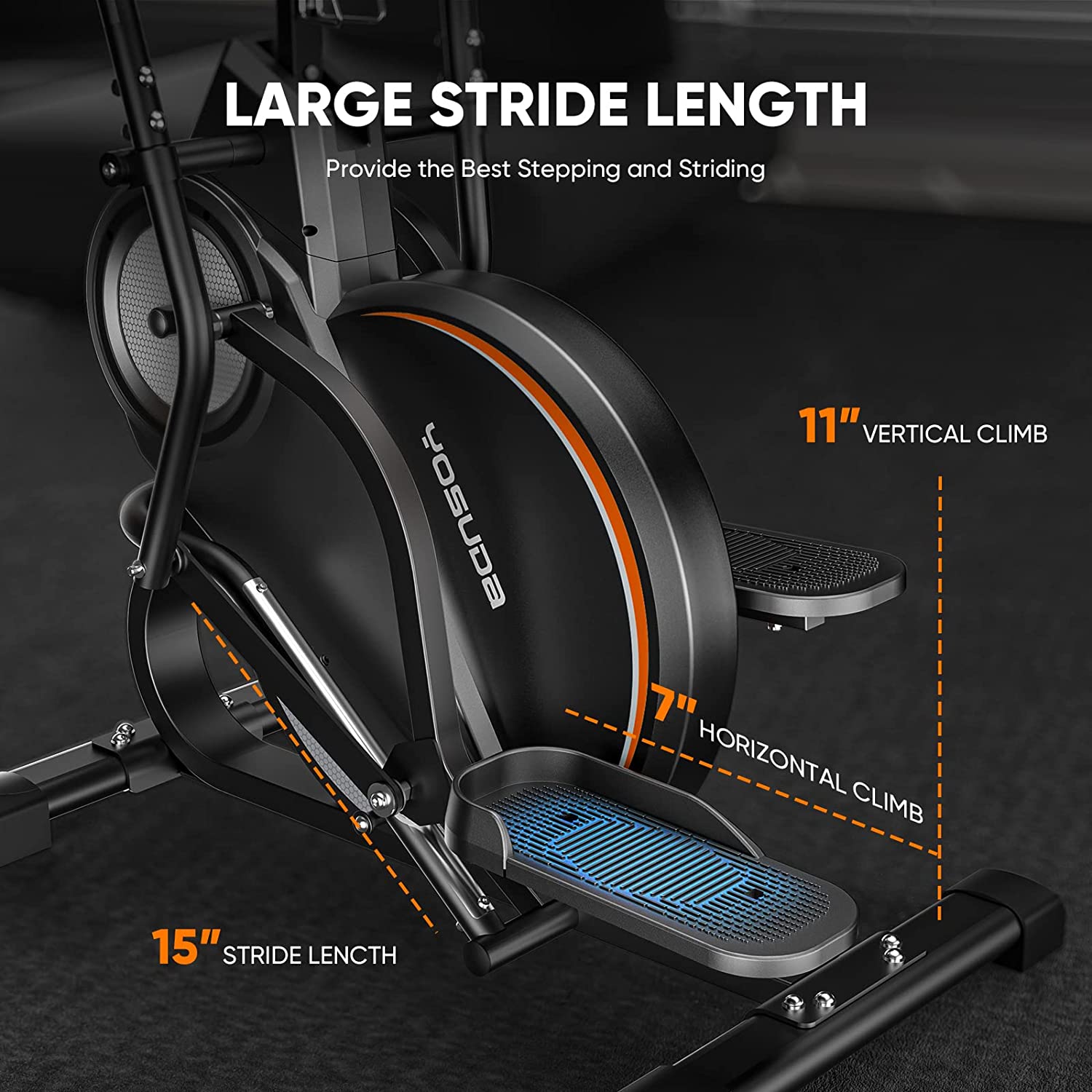 - 【3-IN-1 Home Gym Equipment】YOSUDA elliptical stepper combines the easy, low-impact motion of an Elliptical, and the cardiorespiratory improving power of a Stepper, with calorie burning power of a Treadmill. Extended vertical and horizontal stride length produces a fluid climbing motion aimed to engage your whole body.