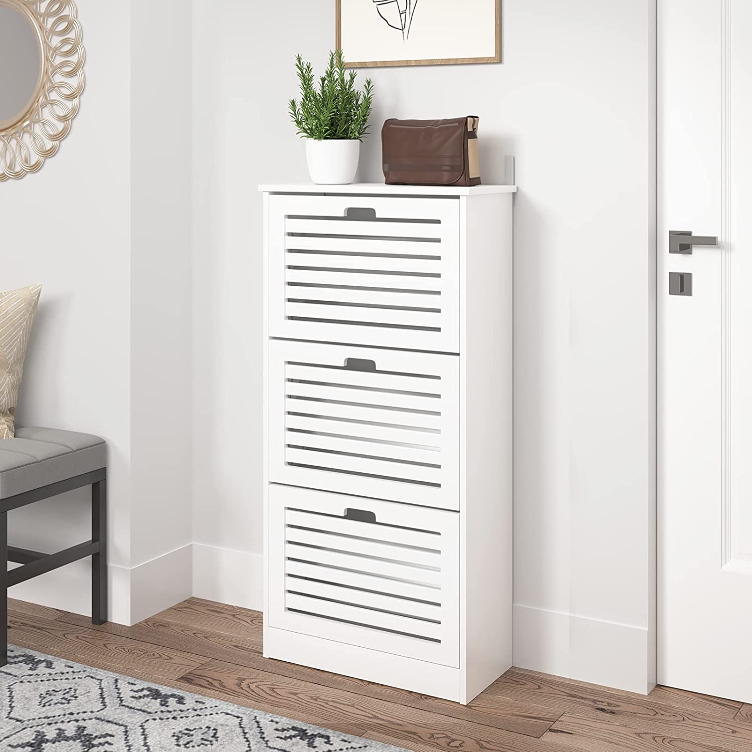 STURDY STRUCTURE: The shoe organizer cabinet adopts waterproof and durable white MDF board, which is easy to wipe. With anti-tipping device on back, it not easy to fall down