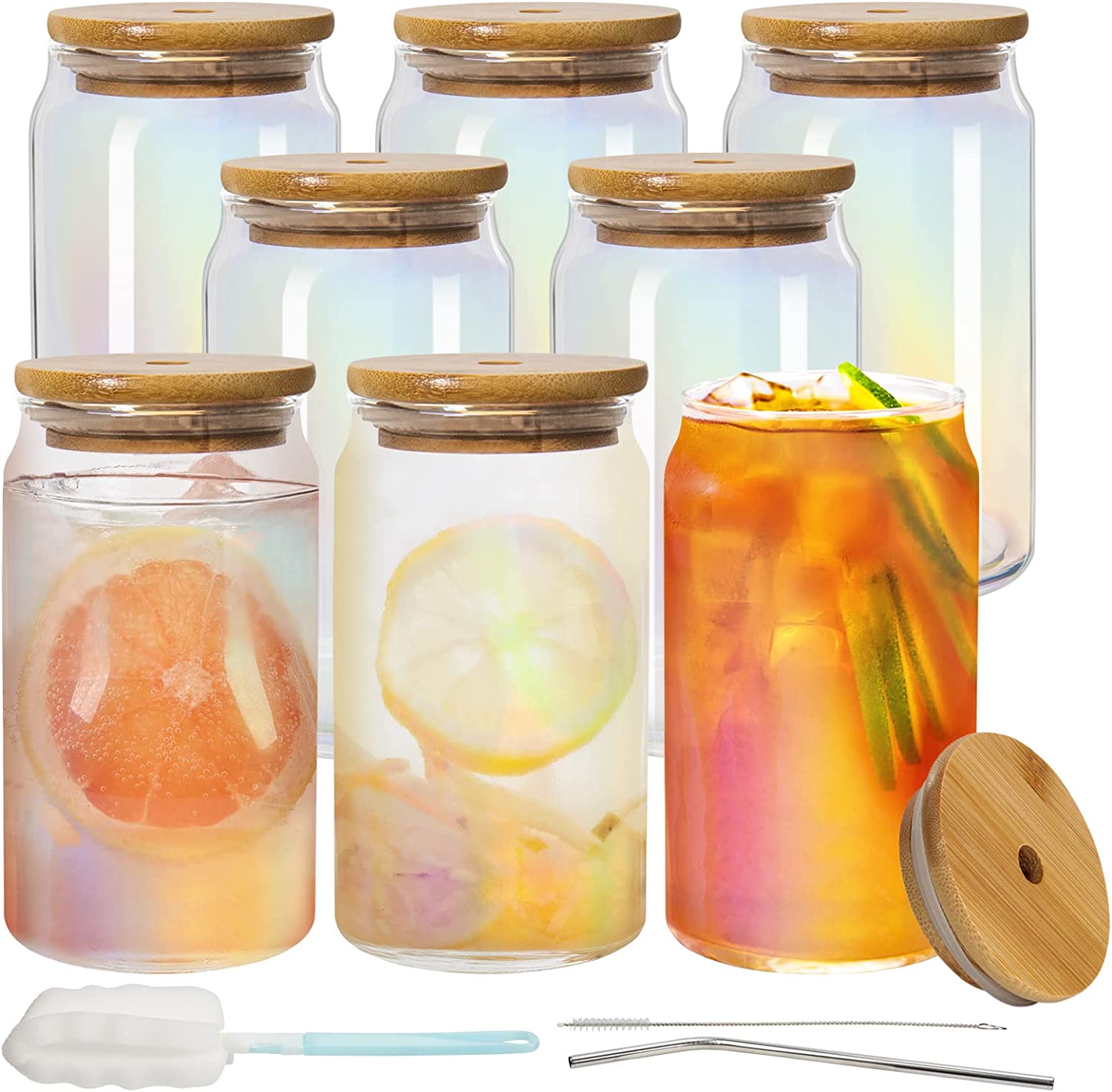 8 Pack Beer Glasses:Juice bottle set includes 8 beer can glasses, 8 nature bamboo lids, 8 stainless steel straws, 1 bottle brush and 1 straw brush.They are all dishwasher safe and refrigerator safe.
