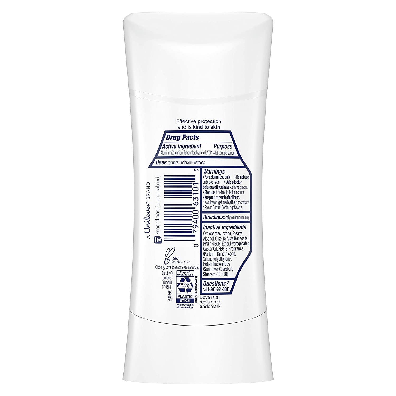 With Dove Advanced Care Invisible Sheer Fresh Antiperspirant Deodorant Stick, you can step out in style. This antiperspirant deodorant for women is proven to be invisible on 100 colors of clothing. Giving you long-lasting protection against underarm sweat and odor, this non-irritating antiperspirant for women will leave your underarms feeling healthy and protected for up to 48 hours. Enriched with our signature 1/4 moisturizers with natural oil, this antiperspirant gives you a dose of underarm care. Its 0 percent alcohol (ethanol) formula helps reduce irritation from shaving and leaves you with the fresh scent of cucumber with notes of freesias, lily and rose. Use Dove women's deodorant regularly and you can enjoy beautifully soft and comfortable underarms that stay dry all day long. For best results, swipe your antiperspirant deodorant stick up and down each underarm until an even layer is applied. Apply this Dove antiperspirant deodorant to dry skin after showering and enjoy fresh, comfortably dry skin from morning to night. Dove is certified cruelty-free by PETA because we believe that real beauty is cruelty-free. We’re on a mission to help women raise their self-esteem – because we believe beauty should be a source of confidence, not anxiety. Dove Antiperspirant Deodorants deliver effective underarm protection and are kind to skin, so women can be free of underarm inhibitions and live beautifully unselfconsciously.