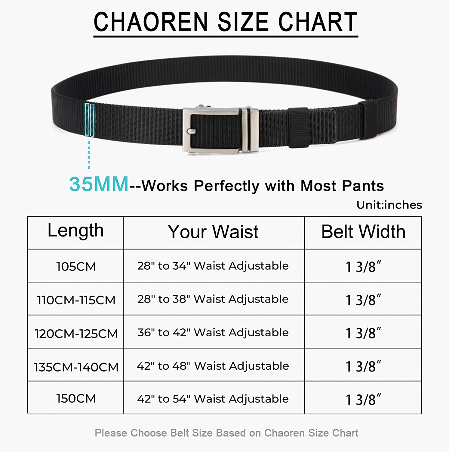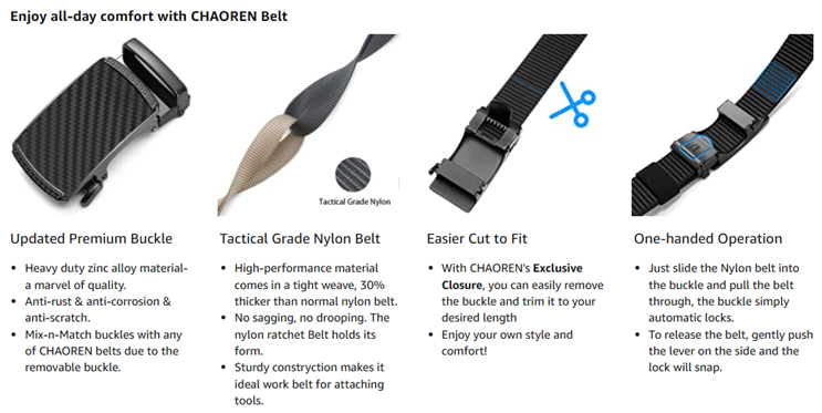 ✦【Exact Fit for Comfort】CHAOREN Ratchet Belt allows for 1/7" micro adjustments for perfect fit everywhere, higher and easier regulation for an extremely comfortable experience. Innovative removable buckle allows you to cut the nylon belt to your Ideal size.