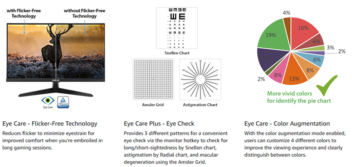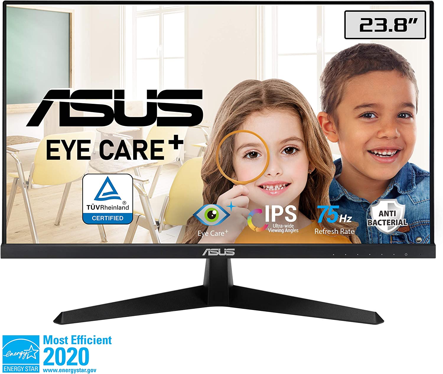 The 23.8” VY249HE monitor is equipped with ASUS BacGuard, a ionic silver treatment applied on the midframe for a more sanitary surface. With Eye Care Plus, the VY249HE features additional color augmentation and rest reminder modes for a more user-friendly experience.