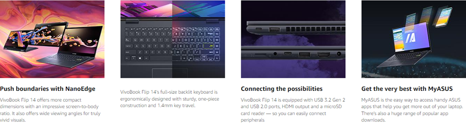 ASUS VivoBook Flip 14 is a convertible laptop that’s full of personality, sporting a sleek Bespoke Black finish and a color-blocked Enter key with yellow edges and text. Ready for performance, VivoBook Flip 14 is powered by up to an AMD Ryzen 7 5700 mobile processor with 8GB memory and features a up to 512GB PCIe SSD. A sturdy 360° hinge holds the display firmly at any angle, giving you the flexibility to use VivoBook Flip 14 as a traditional laptop, a tablet, or anything in between. For Free Windows 11 upgrade eligible devices, visit ASUS Windows 11 website for more information.