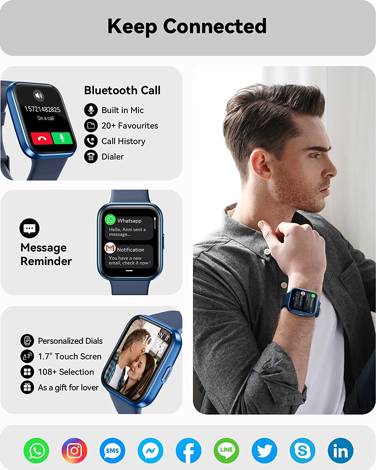 【1.7'' Full Touch HD Screen】Fitness watch features a 1.7'' full touch HD color screen, which can provide excellent picture quality and high sensitivity touch for a better user experience. Smart watch for iPhone compatible has 108+ dials to choose from, and you can also select your favorite photo as a dial in the watch. Upload your anniversary photo and gift it to your lover