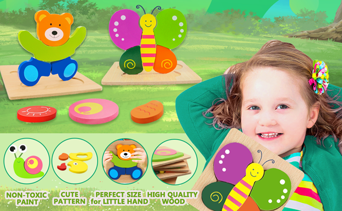 • 【HIGH-QUALITY WOODEN PUZZLES】Made of high-quality, environmental wood with non-toxic water-based paint and have no irritating smell. Smooth edges and easy-grip design allow toddlers to practice and play better. Fits wooden puzzles for toddlers 1-3 toys.