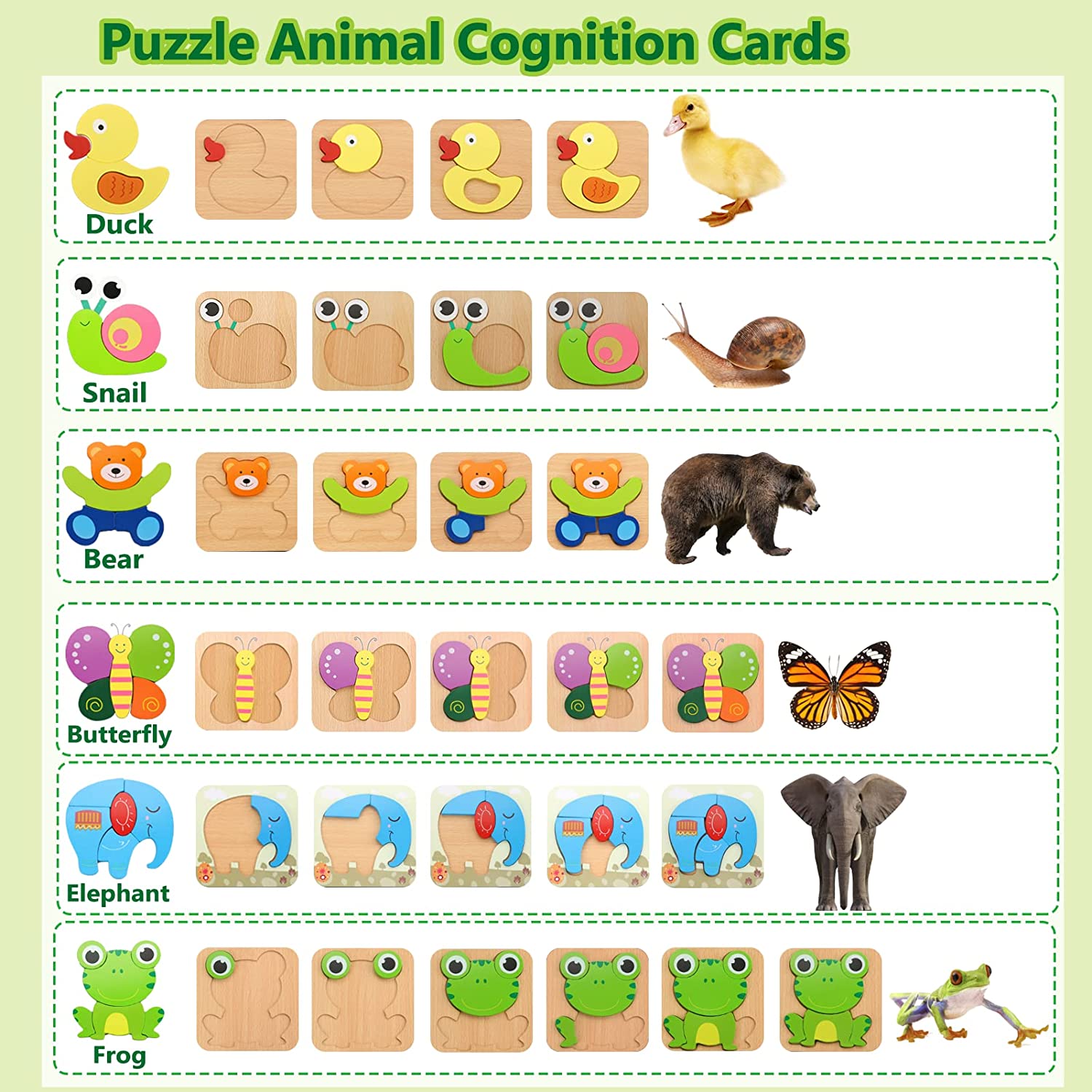 • 【SENSORY LEARNING TOYS】6PCS 3D wooden animal puzzles: duck, snail, bear, butterfly, elephant, frog. Is a sensory toys for toddlers 1-3, can develop toddler's patience, imagination, concentration, colors & shapes recognition and hand-eye coordination.