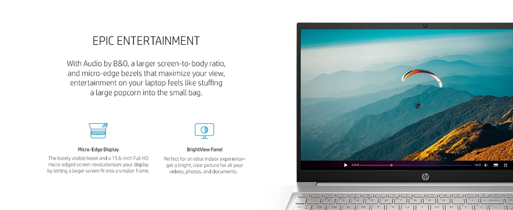 The HP Pavilion 15 Laptop has all the performance for mind-blowing entertainment you enjoy, but in a smaller, lightweight PC. The Full HD, IPS, micro-edge display combines with audio by BandO to give you robust, authentic theater-level entertainment (1). Intel Iris Xe Graphics (2) delivers the impressive performance needed for your creating, gaming, and entertainment while the 11th Generation Intel Core i7-1165G7 processor (3) gives you the instant responsiveness and best-in-class connectivity modern users crave. The HP Pavilion laptop’s 512 GB PCIe NVMe M.2 SSD storage outclasses traditional hard drives with 15 times the performance (4). Experience improved multitasking thanks to 16 GB of RAM. Work all day with up to 8 hours of battery life (5) and go from 0 to 50% charge in approximately 45 minutes with HP Fast Charge (6). Windows 10 Pro blends seamlessly and powerfully with this HP 15 Laptop for an optimized computing experience (7). Get more done with solid connection speeds from the powerful Wi-Fi 6 (2x2) (9) and Bluetooth 5.0 combo (10) and work comfortably with the familiar feel of a full-sized keyboard. Your HP laptop checks all the boxes with a 1-year limited hardware warranty, ENERGY STAR certification (12), EPEAT Silver registered (13), and a low halogen display (14). (1) Full High Definition (FHD) content is required to view FHD images. (2) Shared video memory (UMA) uses part of the total system memory for video performance. System memory dedicated to video performance is not available for other use by other programs. (3) Multi-core is designed to improve the performance of certain software products. Not all customers or software applications will necessarily benefit from the use of this technology. Performance and clock frequency will vary depending on the application workload and your hardware and software configurations. Intel’s numbering, branding, and/or naming is not a measurement of higher performance. Intel, Pentium, Intel Core, Celeron, Iris Xe, Intel logo, and the Intel Inside logo are trademarks of Intel Corporation in the U.S. and other countries. (4) Based on HP internal testing using CrystalDiskMark benchmarking software. Performance is sequentially faster (read-only) compared to traditional 5,400 rpm HDD. (5) Windows 10 MobileMark 18 battery life will vary depending on various factors including product model, configuration, loaded applications, features, use, wireless functionality, and power management settings. The maximum capacity of the battery will naturally decrease with time and usage. See bapco.com/products/mobilemark-2018/ for additional details. (6) Recharges your battery up to 50% within 45 minutes when the system is off (using “shut down” command). Recommended for use with the HP adapter provided with the notebook, not recommended with a smaller capacity battery charger. After charging has reached 50% capacity, charging speed will return to normal speed. Charging time may vary plus/-10% due to System tolerance. (7) Not all features are available in all editions or versions of Windows. Systems may require upgraded and/or separately purchased hardware, drivers, software, or BIOS update to take full advantage of Windows functionality. Windows 10 is automatically updated, which is always enabled. ISP fees may apply and additional requirements may apply over time for updates. See microsoft.com (8) Upgrade rollout plan is being finalized and is scheduled to begin late in 2021 and continue into 2022. Specific timing will vary by device. Certain features require specific hardware, see http://www.Microsoft.com/windows/windows-11-specifications (9) Wireless access point and internet service required and sold separately. Availability of public wireless access points limited. Wi-Fi 6 (802.11ax) is backwards compatible with prior 802.11 specs. The specifications for Wi-Fi 6 are draft and are not final. If the final specifications differ from the draft specifications, it may affect the ability of the notebook to communicate with other Wi-Fi 6 devices. Only available in countries where 802.11ax is supported. (10) Bluetooth is a trademark owned by its proprietor and used by Hewlett-Packard Company under license. (11) Based on Wi-Fi 5 80MHz and Wi-Fi 6 160MHz minimum requirements when transferring files between two devices connected to the same router. Requires a wireless router, sold separately, that supports 802.11ax (Wi-Fi 6). Only available in countries where 802.11ax is supported. (12) ENERGY STAR and the ENERGY STAR mark are registered trademarks owned by the U.S. Environmental Protection Agency. (13) Based on U.S. EPEAT registration according to IEEE 1680.1-2018 EPEAT. EPEAT status varies by country. (14) External power supplies, power cords, cables, and peripherals are not Low Halogen. Service parts obtained after purchase may not be Low Halogen.