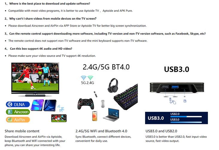 - Resolutions—The Android box 2022 supports 4K, but please confirm that if your TV supports 4K resolution or not and 4K Video source. And the Netfli only supports 720P, Prime Video only supports 1080P for android tv boxes.