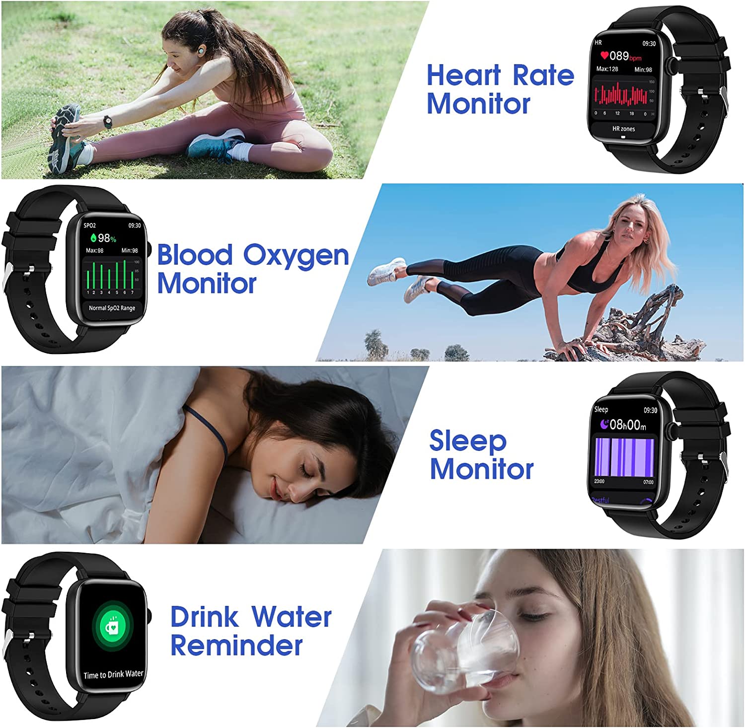 【Intelligent Notification and Health Reminder】Smartwatch for men women notify you incoming calls, SMS notifications. when you connect the smartphone with fitness tracker. Connect fitness tracker with your phone, you will never miss a call and a message. The smart watches for android phones will vibrate to alert you if your phone receives any notifications. You can reject calls and view message directly from your watch. A best gift for family and friends. Note:Can't reply to message