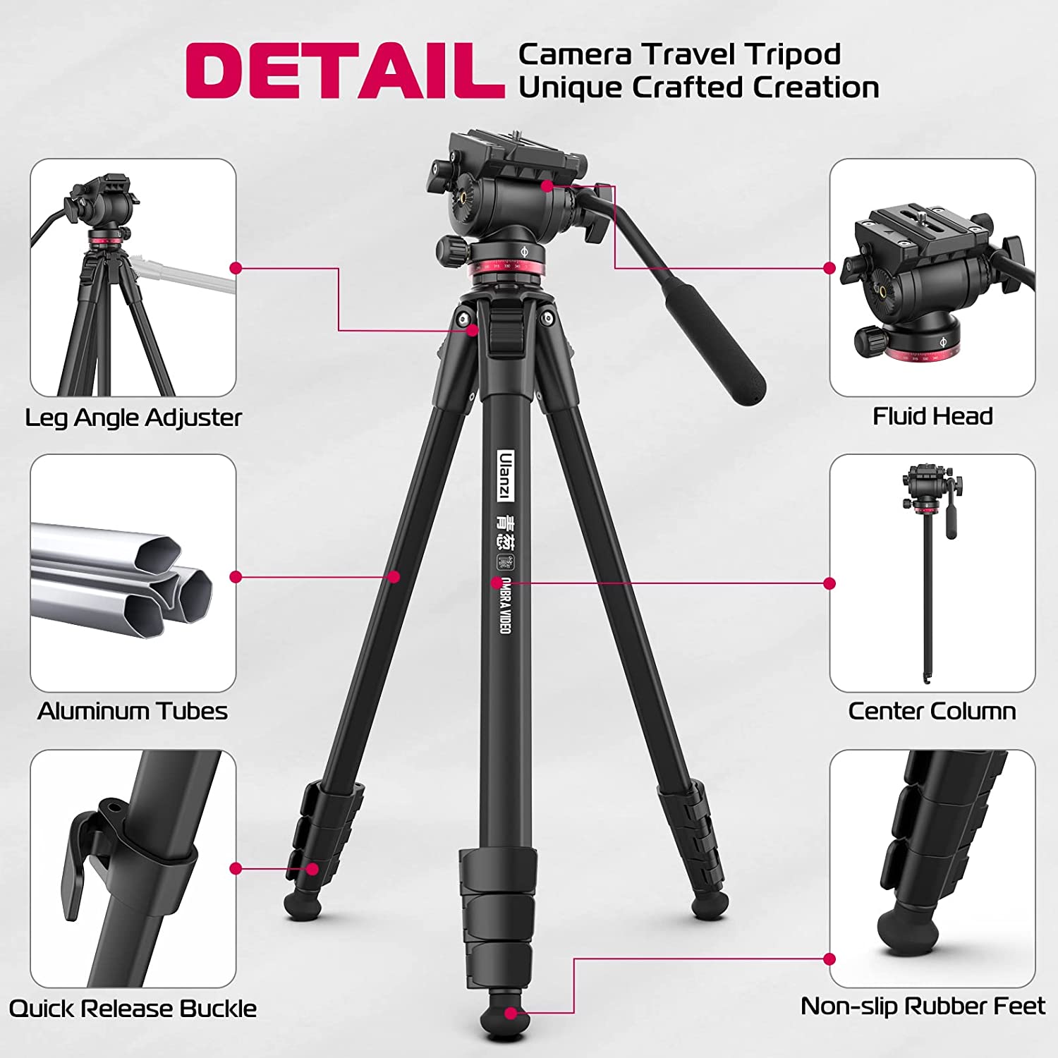ULANZI MT-56 Ombra Video Travel Tripod, 63" Professional Camera Tripod with Fluid Pan-tilt Head, Aluminum DSLR Tripod Max Load 13.2 LB for Nikon Canon DSLR Camcorder, Phone Holder Included