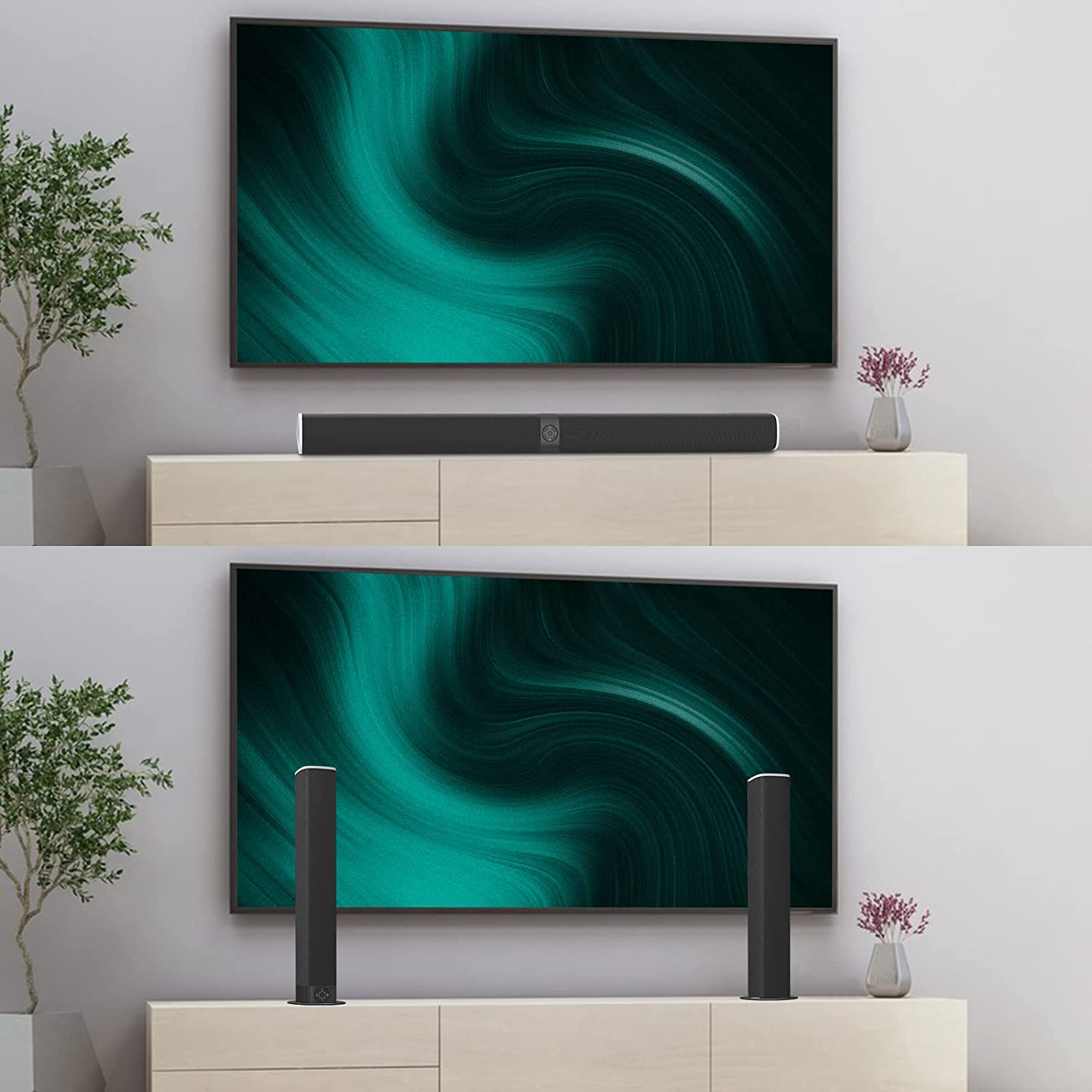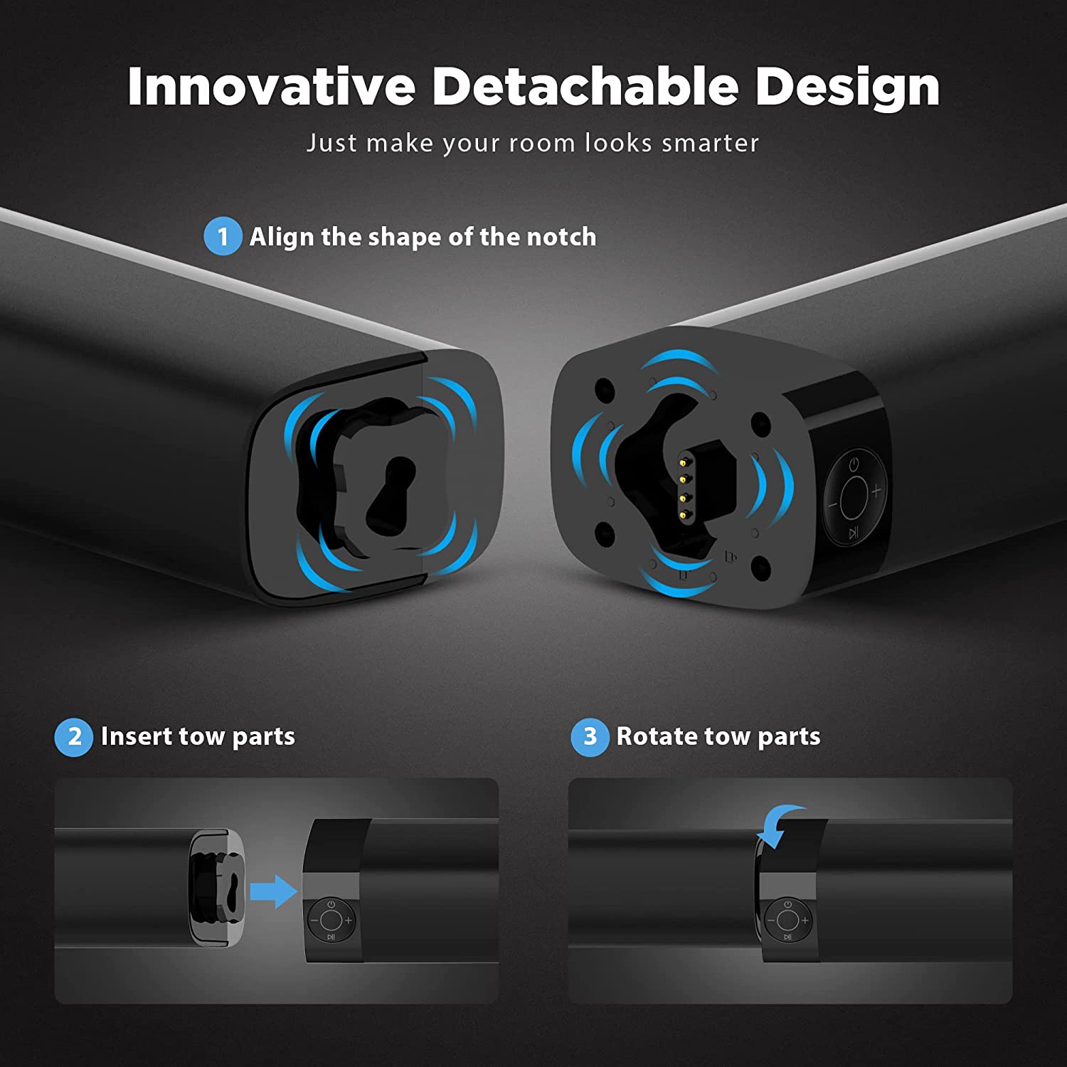 【Multiple Wired Connections+ 2 in 1 Detachable Design】: Optical/HDMI/AUX connections for almost devices. Innovative Detachable Design - Splits into 2 stereo soundbars and attaches to a base, space saving, retro and elegant, a great addition to your room.