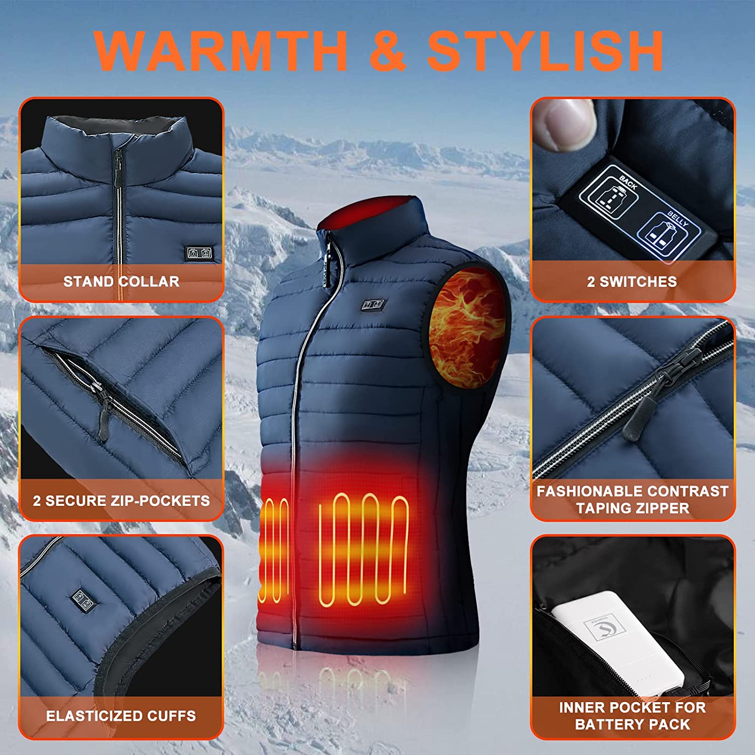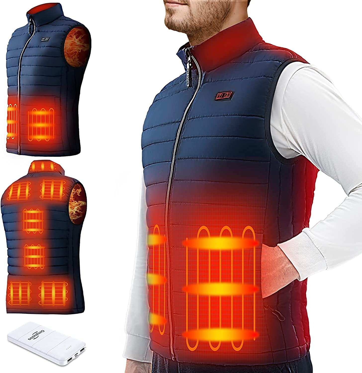 - Unique Design-It is well designed, the collar zipped up is form fitting to neck and doesn't rub on jaw line. And separate pocket on the inside of the vest for the battery makes it easier to charge your vest. It is a slim fit, if you want to make it as an outer layer, or more loose, you can choose one size larger than your usual size. it's perfect for outdoor activities like hunting, camping, mountain climbing, hiking, skiing, golf, or some other outdoor works.