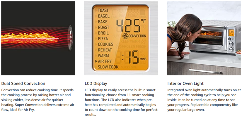 - LCD DISPLAY: LCD display to easily access the built in smart functionality, choose from 11 smart cooking functions; The LCD also indicates when pre-heat has completed and automatically begins to count down on the cooking time for perfect results
