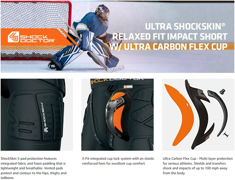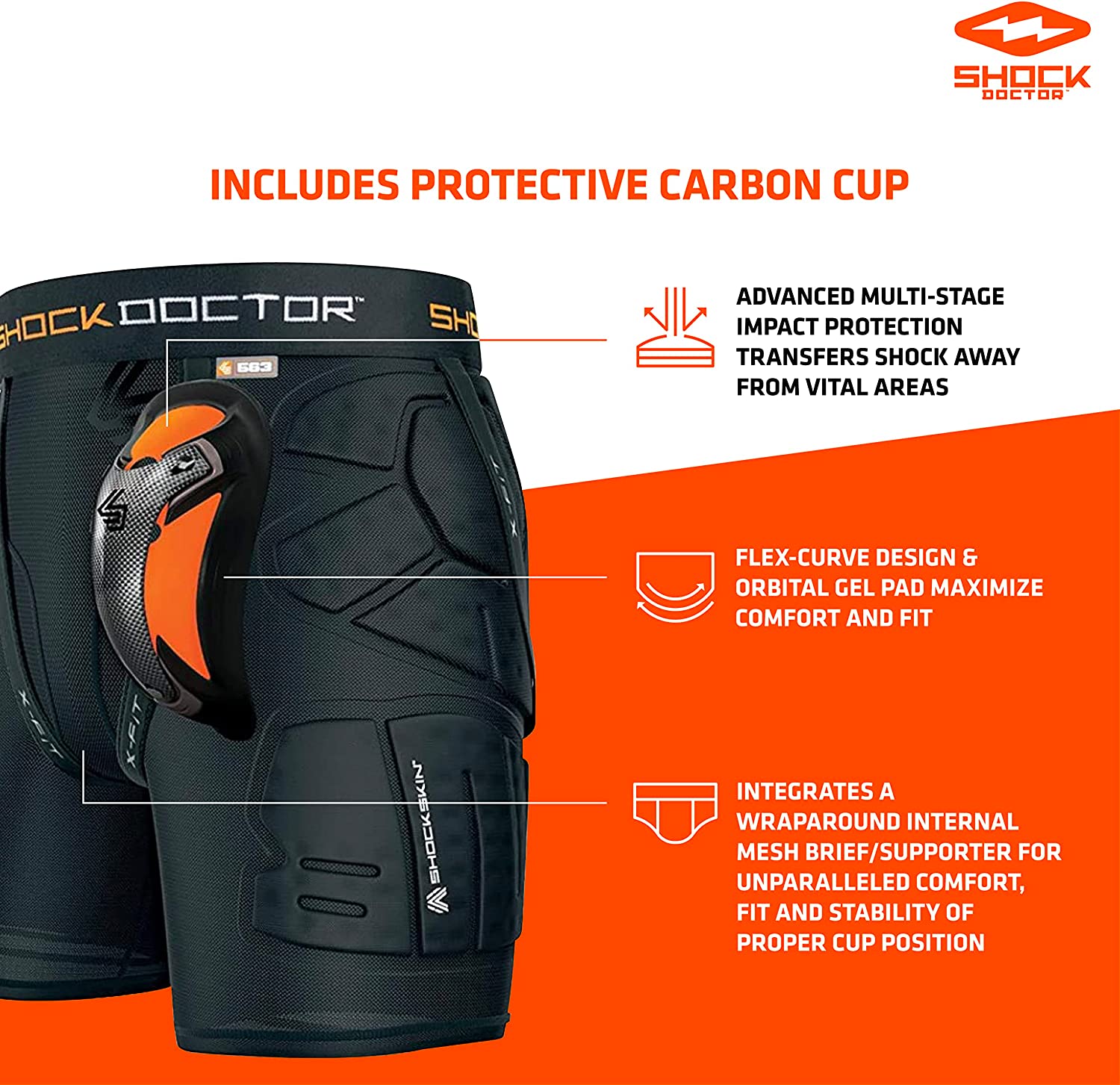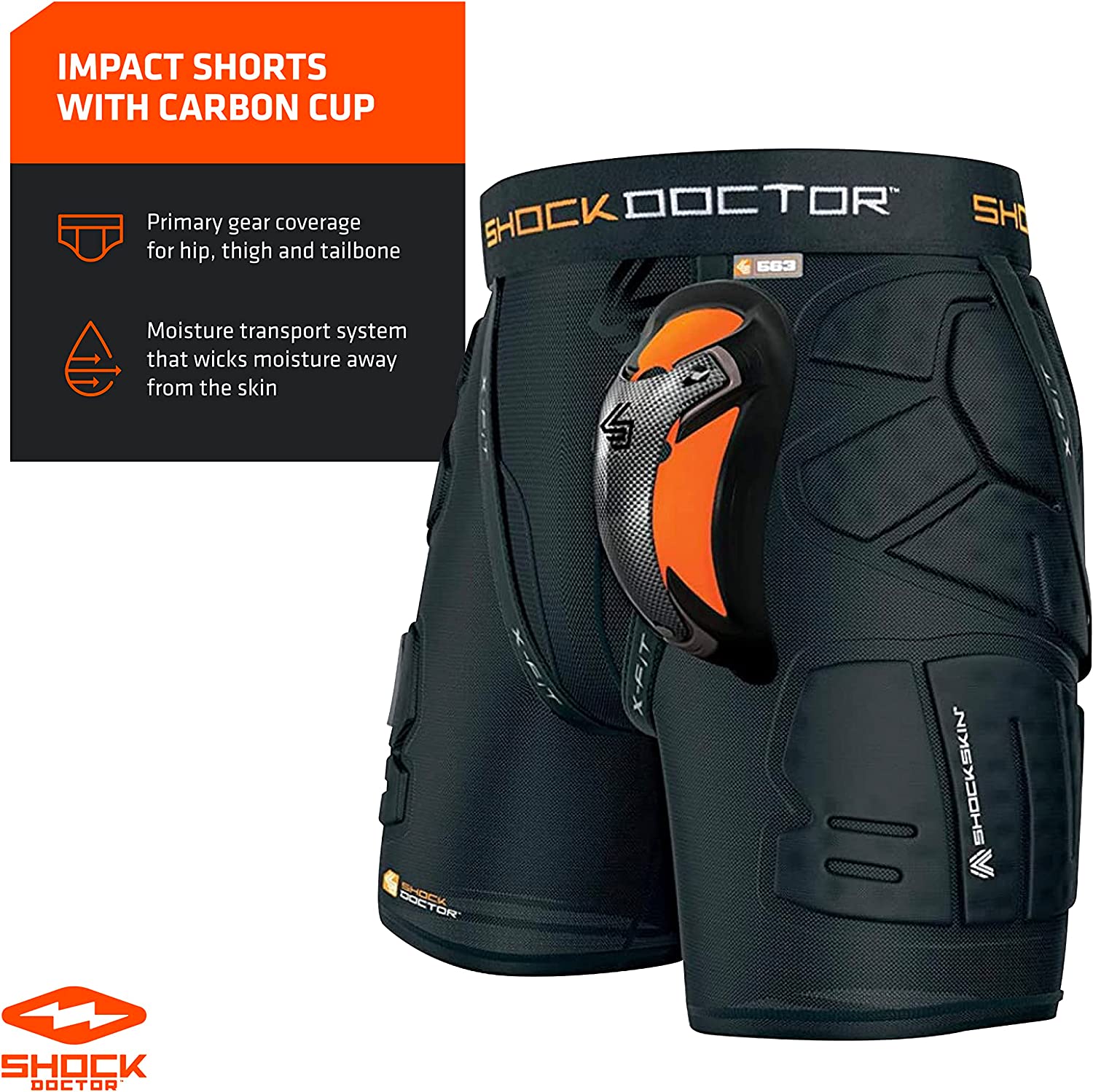 • COMFORTABLE PROTECTION: Shock Doctor Men's Impact Shorts come with an Ultra Carbon Flex Cup, designed to ultra-protect and contour to hips, thighs, and tailbone with ShockSkin padding.