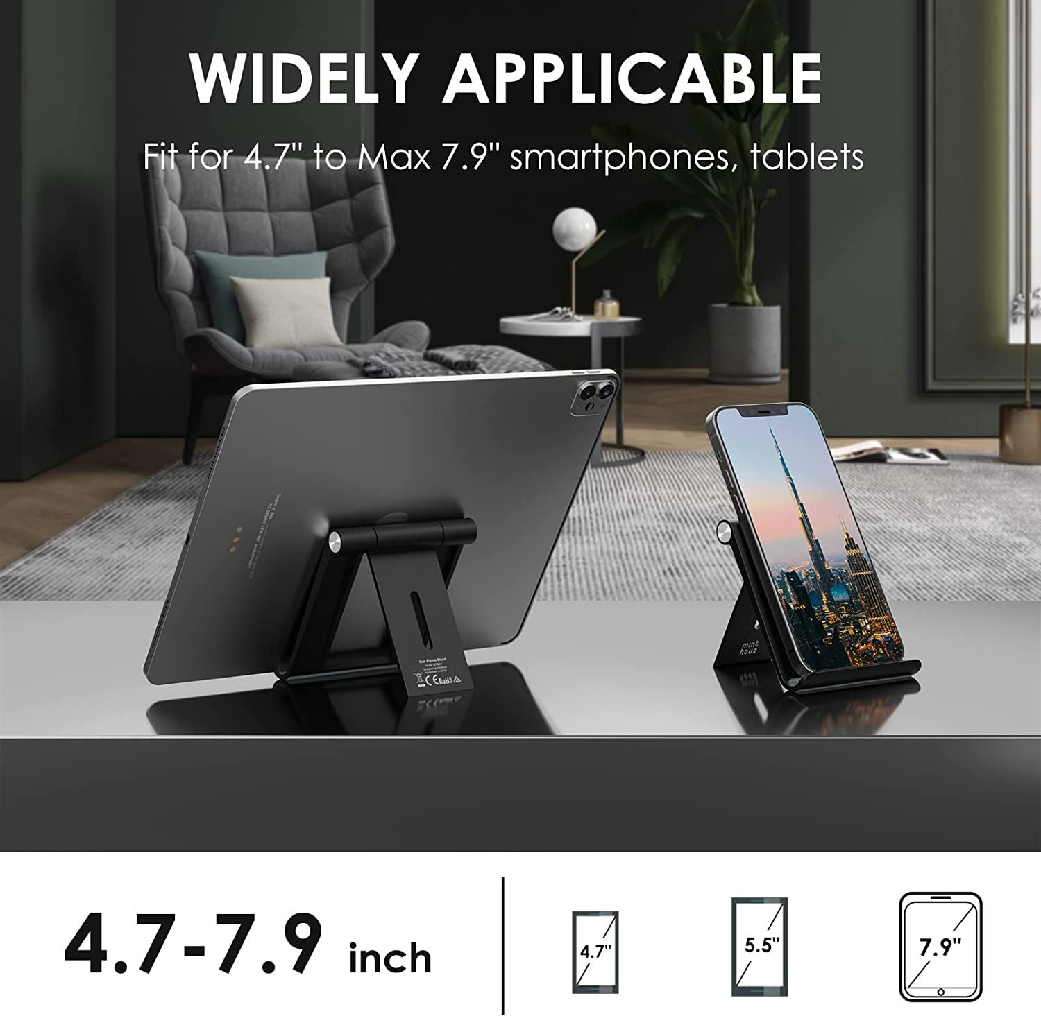 Minthouz Adjustable Cell Phone Holder for Desk - Foldable Phone Stand Compatible with iPhone 14 13 12 Pro Max Mini 11 Xr 8 Plus SE, iPad Mini, Switch, Android Smartphone, Tablets - Black