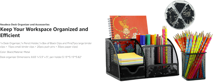 - [Office Desk Organizers and Accessories] Neudeco is proud to release our new desk organizer, perfect for all your office supplies. With multiple compartments, a drawer, paperclip holder, and pen organizer, this desk accessory is designed to keep your workspace organized and clutter-free.
