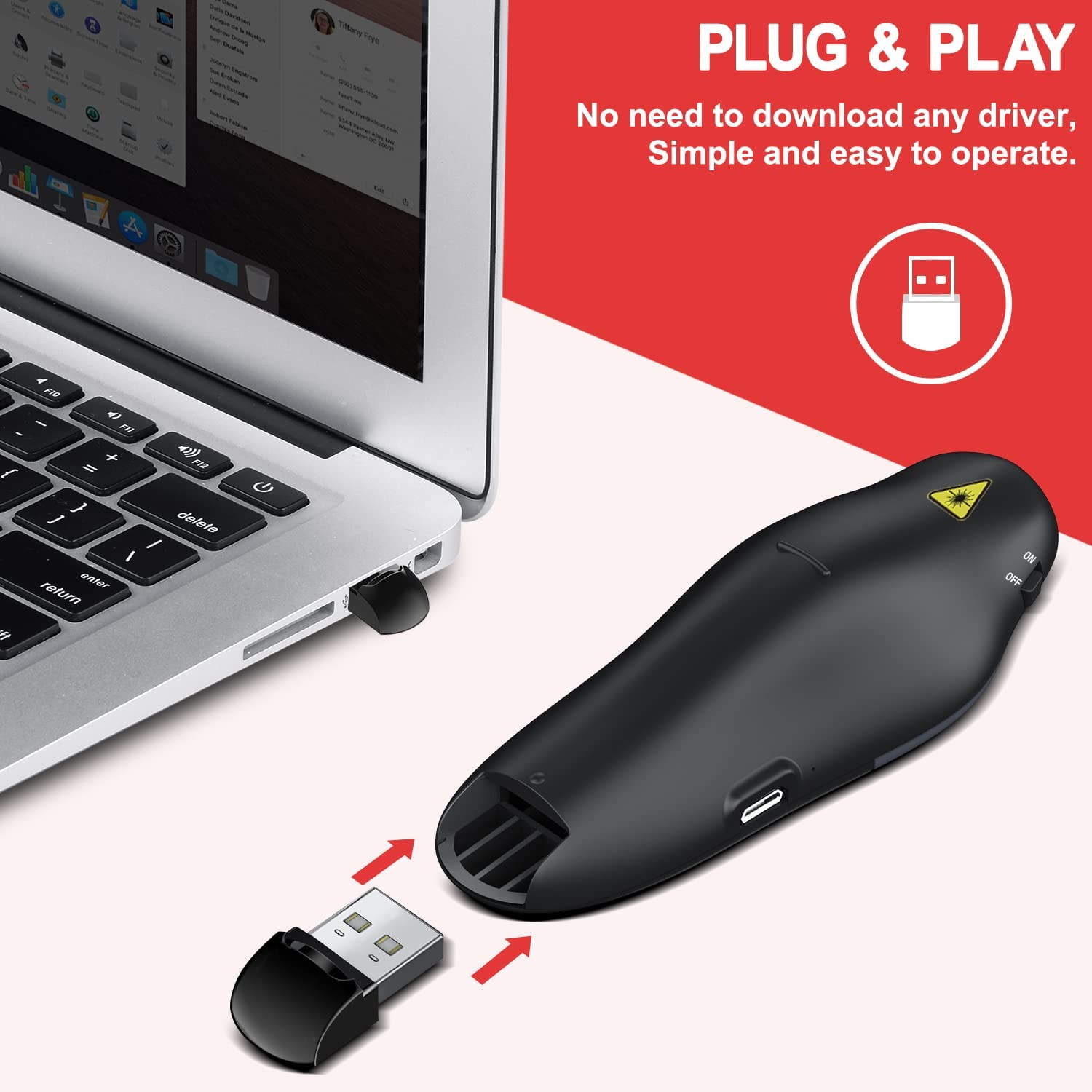 【WIDELY COMPATIBLE LASER POINTER FOR PRESENTATIONS】 USB plug and play, no software installation. Clicker support systems for laptop presentations: Windows 2003 / Vista/XP/ 7/8/10, Linux, Mac, Android; Supported software: Word, Excel, PowerPoint, Google Slides, Keynote, Prezi, PDF, Word, ACD Seel, Website, iWork (Keynote & Numbers & Pages). Computer Clickers support devices for demonstration: Macbook Air, Macbook Pro, Surface Pro, PC, Computer, etc.