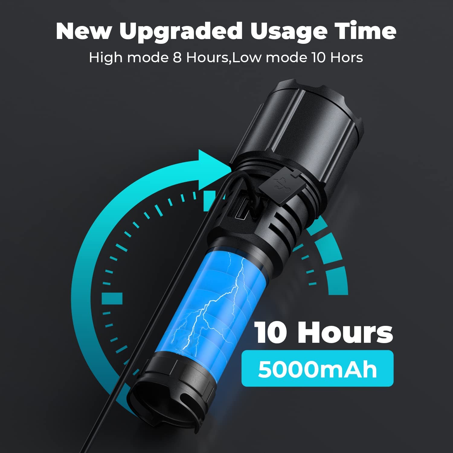 【USB Rechargeable & Power Display】2 Pack Rechargeable Flashlights built in fast charging,and comes with 5000 mAh large-capacity power supply,You can experience up to 12 hours of brightness with a full charge.You can see the remaining power of the flashlight and charge it in time.