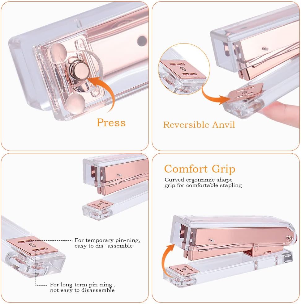 Rose Gold Office Supplies and Accessories, Acrylic Stapler, Staple Remover, Tape Dispenser, Pen Holder, Phone Holder, Scissors, Paper Clips, Binder Clips, 2 Pen and 1000 pcs Staples