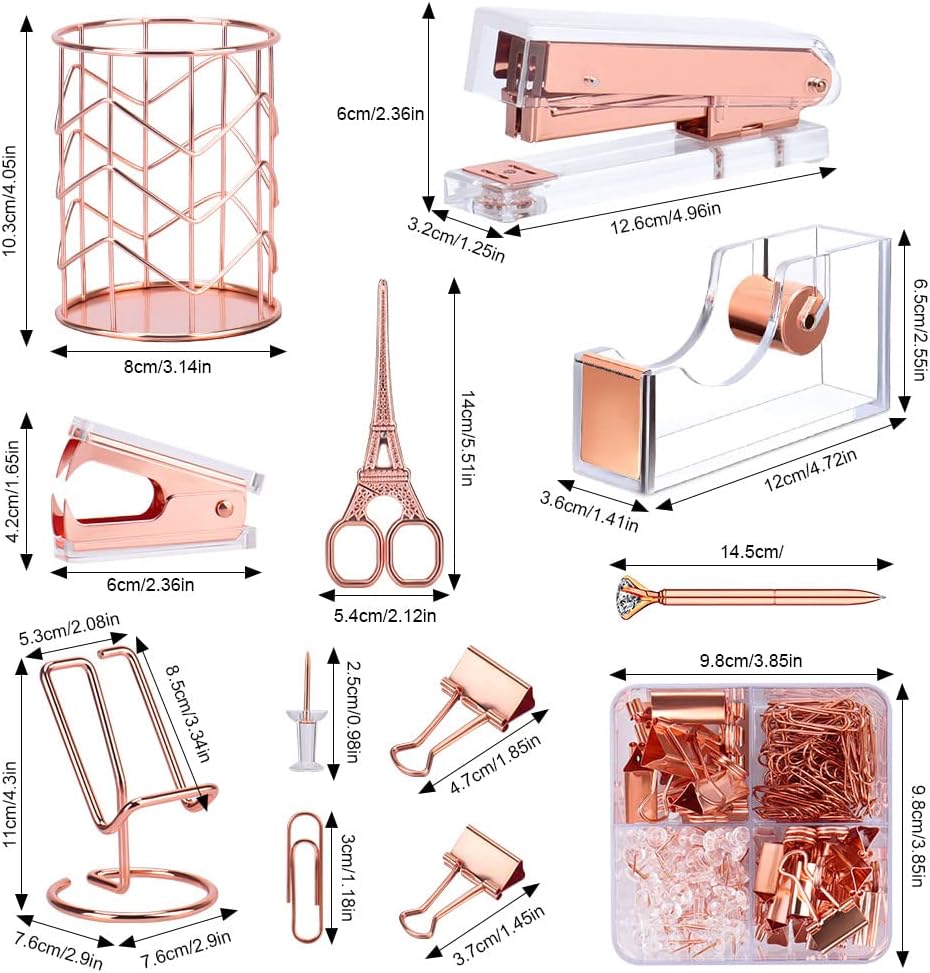 • ✅Perfect Size: Our rose gold stationery sets come in regular sizes, so they're just the right fit for any desk. Our stapler, tape dispenser, staple remover, and scissors are lightweight and easy to handle, while our pen holder and cell phone holder offer ample space to hold your essentials.