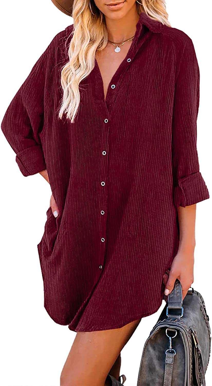 Astylish Women Casual Long Sleeve Button Down Oversized Corduroy Shirt Dress with Pocket