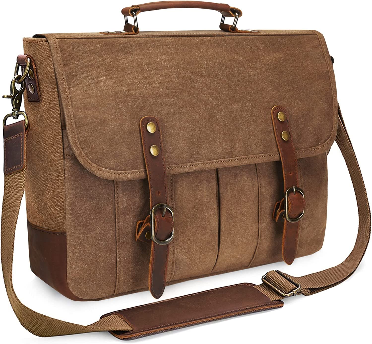 STUDRY & WATERPROOF: The mens messenger bag is presented in high density waxed canvas and genuine leather, crafted with quality solid hardware, durable and functional. Every scrape on surface create a modernized vintage look. The briefcase's dimension is 15.4""L * 4.3""W * 12.2""H, great for college, work or travel.