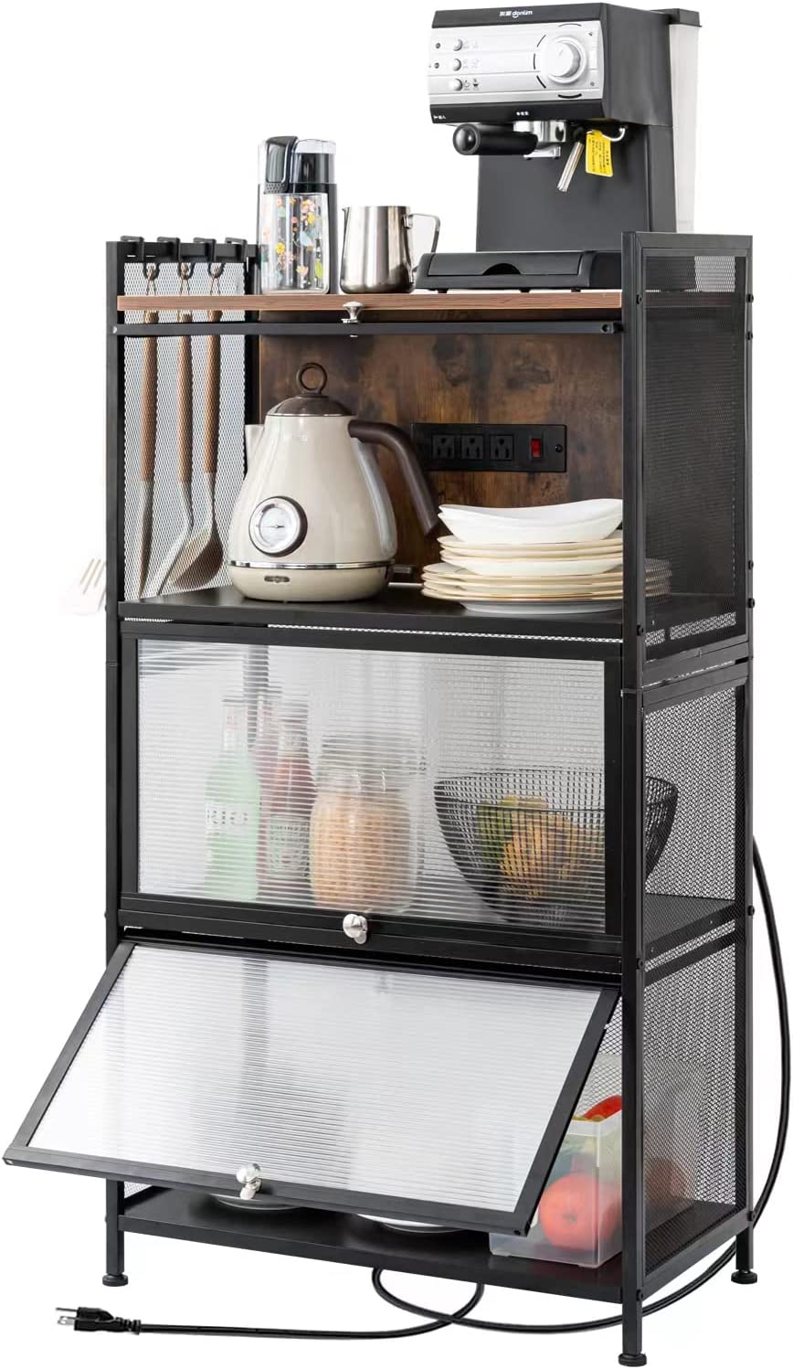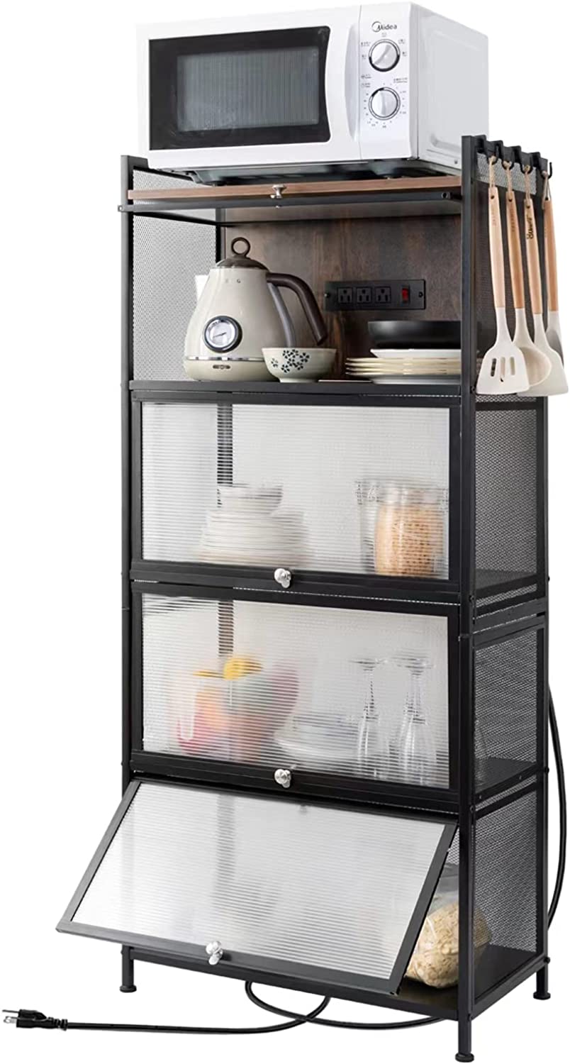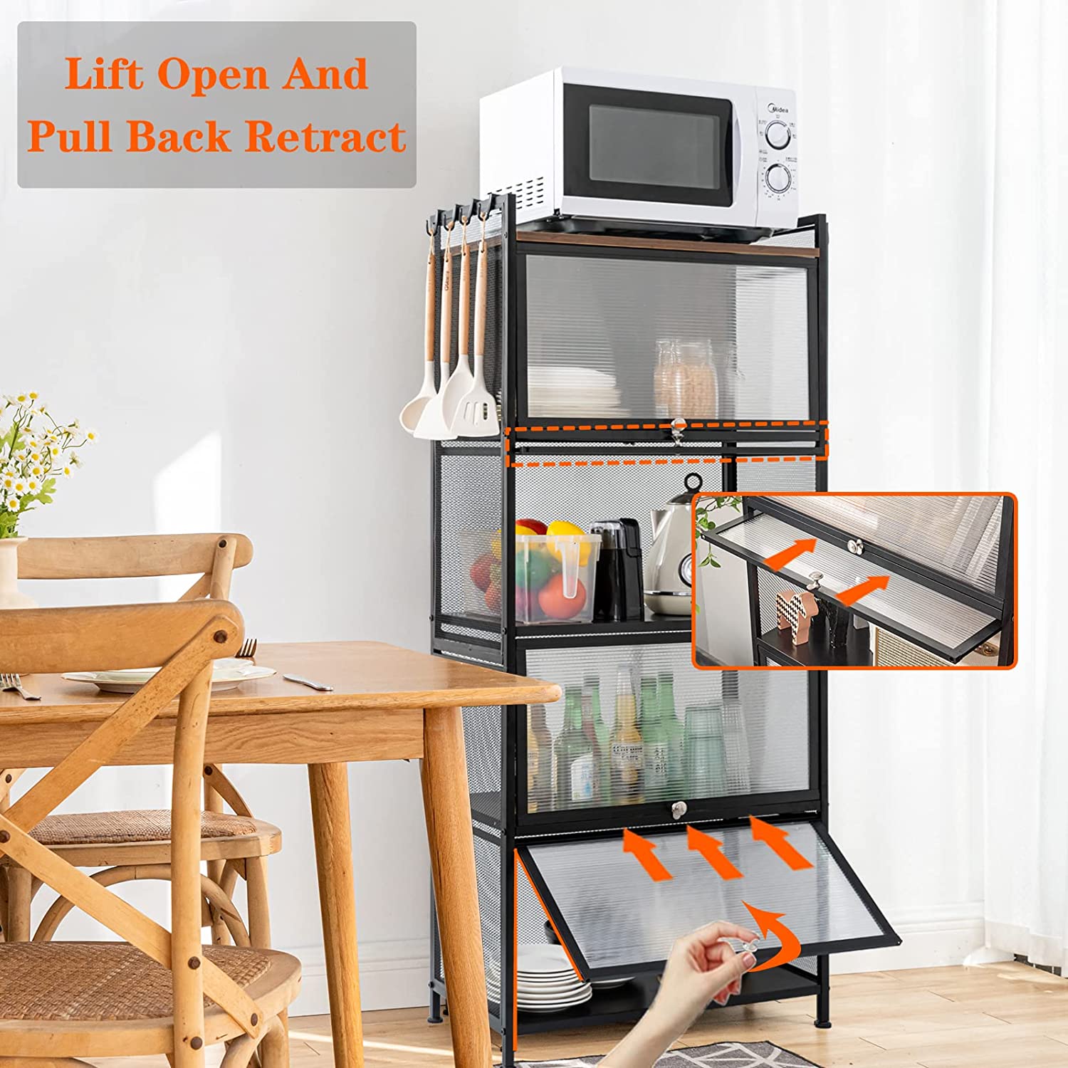 • 【High Quality Materials and Elegant Style】The 5-layers kitchen shelves is composed of wood panel, PC door panel and steel bracket & back panel. The brackets & backboard are painted with high technology, smooth to the touch, strong and durable; the panel is made of thickened wave pattern flip-up PC door panel, transparent and textured. Super large capacity storage space with 8 S-hooks. The combination of retro and modern style is both beautiful and practical.