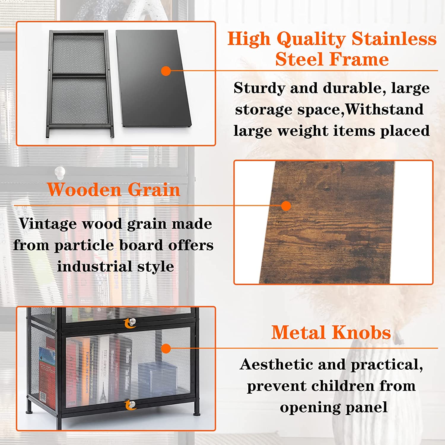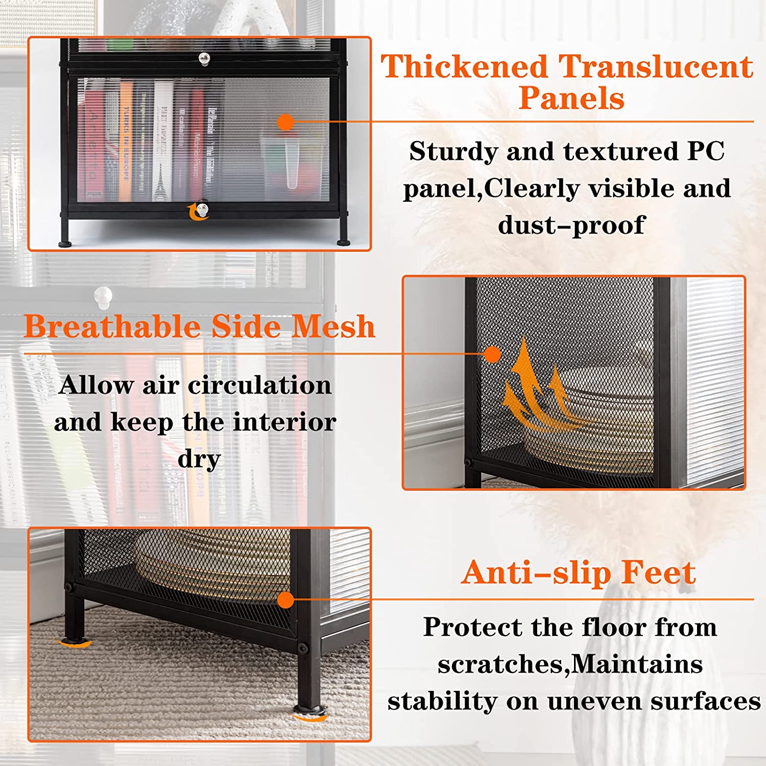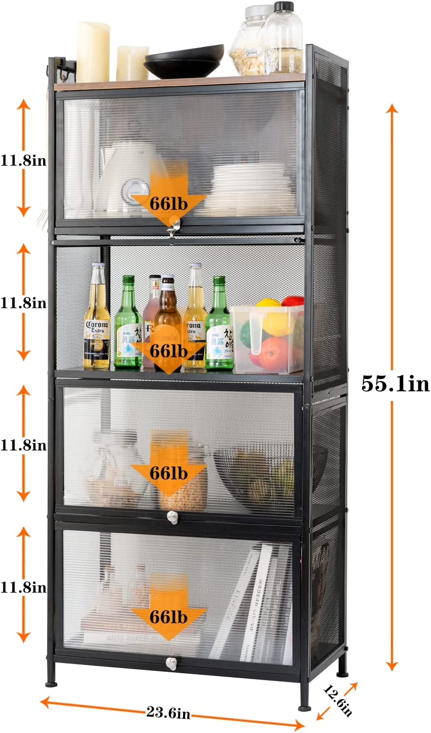 • 【High Quality Materials and Elegant Style】The 5-layers kitchen shelves is composed of wood panel, PC door panel and steel bracket & back panel. The brackets & backboard are painted with high technology, smooth to the touch, strong and durable; the panel is made of thickened wave pattern flip-up PC door panel, transparent and textured. Super large capacity storage space with 8 S-hooks. The combination of retro and modern style is both beautiful and practical.