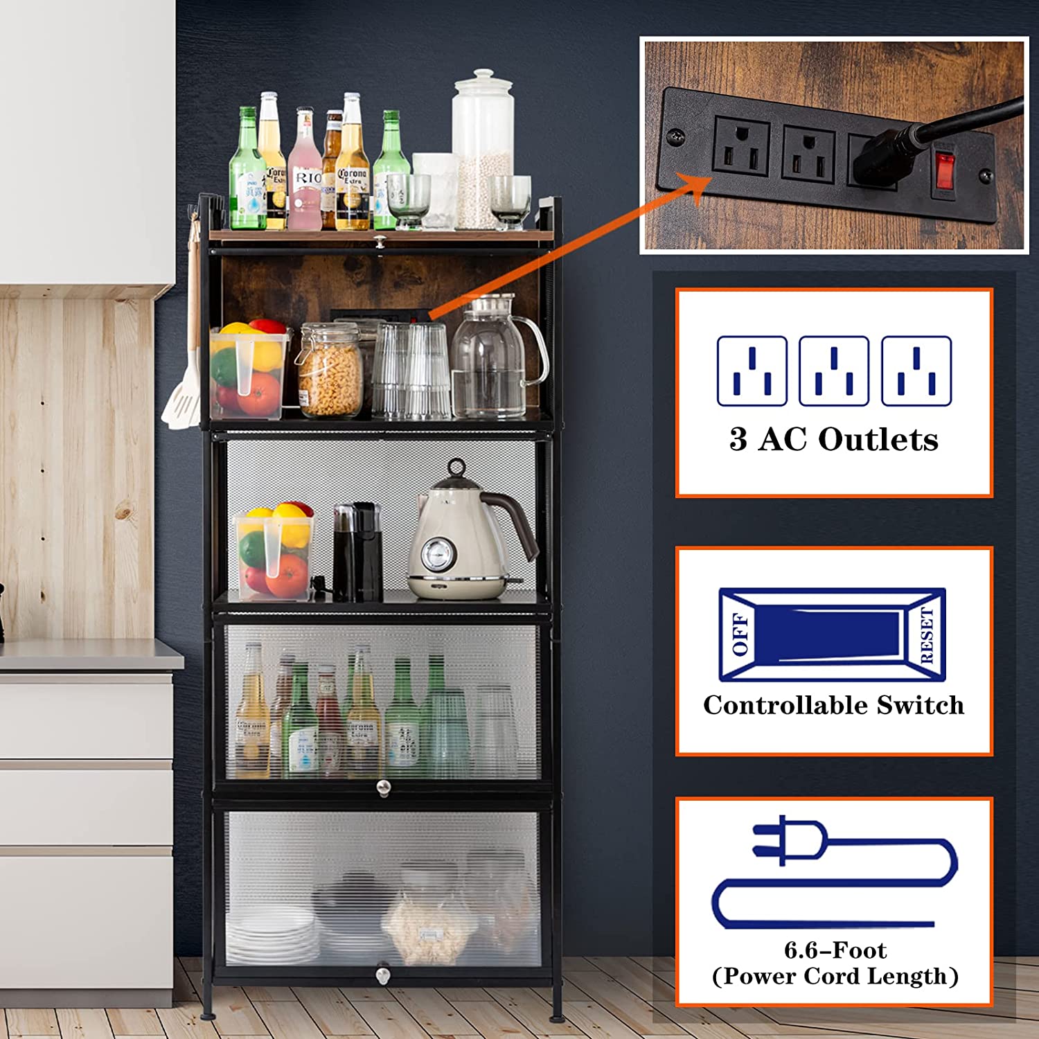 • 【Baker’s Rack with Power Outlets】Always need extra power strips? This kitchen storage rack has 3 power outlets an on/off button for easy on/off and an extra long 6.6ft cord to easily charge the coffee maker or toaster in your kitchen. The high quality and safe power supply supports a variety of small kitchen appliances.