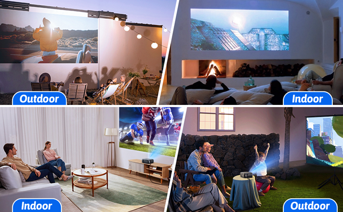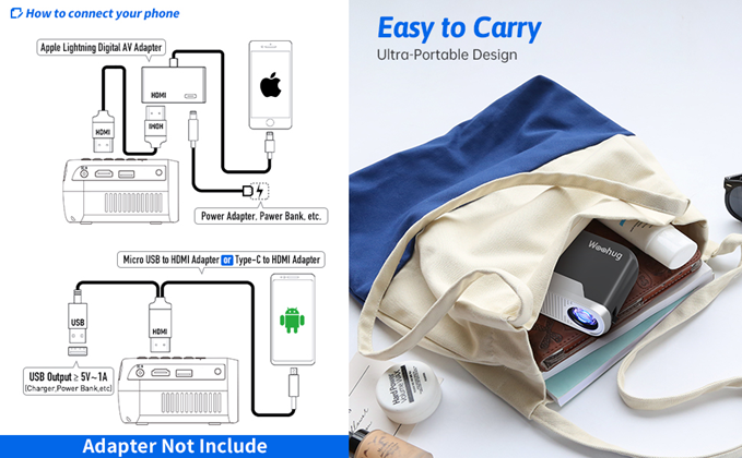 • Mini Portable Projector: This Portable projector is designed in small size ( 5.63"*3.78"*2.28"/0.75 lb ). It is small enough to fit in your bag. Therefore, it is rather light and handy to carry when you go out(Support Power Bank Supply). Ideal for home theater projector video in the backyard, hosting parties, and movie nights while traveling.
