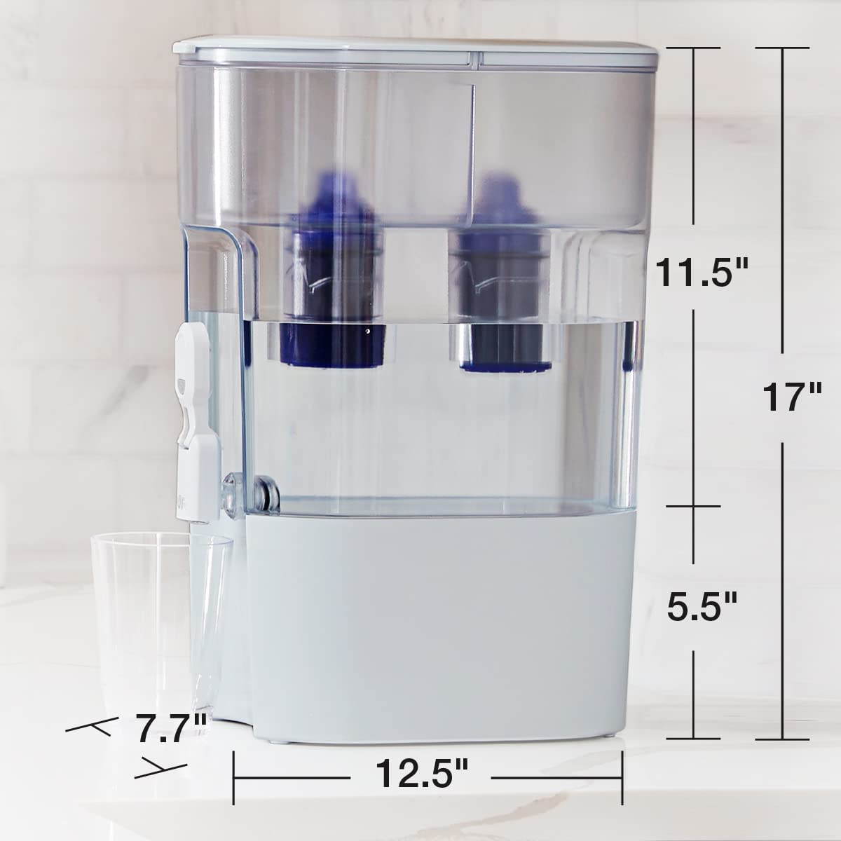 While home tap water may look clean, contaminants can get into your water through household plumbing. The PUR 44-Cup Filtered Water Dispenser offers refreshing water, quickly and easily. It’s an extra-large capacity water filter dispenser that holds up to 2.75 gallons – the largest capacity dispenser available! It includes 2 filters to last twice as long and filter twice as fast and a filter change light for replacement reminders. The elevated, space-efficient design is ideal for placing on the kitchen counter for everyday use and entertaining. Plus, the removable stand features filter storage for up to 6 extra PUR filters. PUR’s superior filter technology uses activated carbon and ion exchange media and is certified to reduce 2x more contaminants than Brita's leading pitcher filter.*ƚ Each PUR water filter is certified to reduce Mercury and certain Industrial Pollutants as well as reducing chlorine (taste and odor) and more.ƚ Using a PUR water filter system can save up to $1,000 per year on average compared with the cost of bottled water** and help keep plastic bottle waste out of landfills. Each filter is certified for up to 40 gallons. Replace your filters less often than with a single-filter system. Replace every 4 months when the filter change light turns red. Generic and private filters are not tested or certified for use in PUR filters. Genuine PUR filters are the only filters certified to reduce contaminants when used with PUR systems.ƚ Disclaimers: ƚ PUR does not filter microbes *Versus best-selling Brita® pitcher filter OB03. Brita® is a trademark of Brita LP. **Based on comparing a year's worth of bottled water (16.9 oz) to a PUR Dispenser a year's worth of 9 refills. Based on Nielsen US Scantrack sales.
