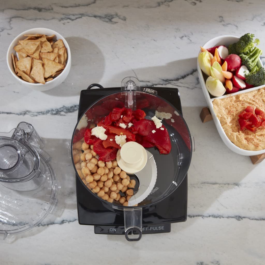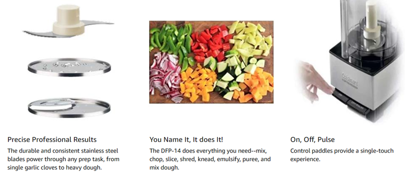 The Cuisinart DFP-14BCNY custom food Processor has an extra-large Feed tube that holds whole fruits and vegetables. Features a 14-Cup work bowl, 4mm stainless steel Medium slicing disc, stainless steel shredding disc, and chopping/mixing blade. Includes a spatula and recipe book.