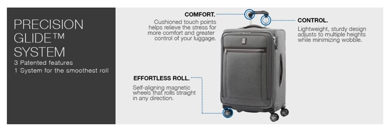 • PrecisionGlide System delivers precise control and effortless roll on eight MagnaTrac self-aligning spinner wheels led by a height-adjustable PowerScope handle with comfortable Contour Grip.