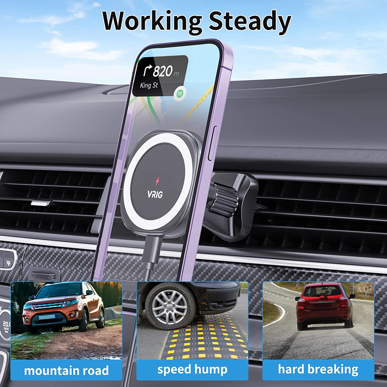 • ? Convincing quality and universal compatibility: VRIG car phone stand has passed magnetic force, telephone signal, hook stability and ingredient safety tests. The quality shall be strictly controlled. The car stand holds most smartphones and mini tablets compatible with iPhone 14 13 12 11 pro max/XR/X/8/7/6/5, Note 9/Galaxy Note20 U, S21 S20 S10 S9 S8 S7 S6, iPad Air 2/mini 3/pro 9.7 and more. This product can be used with MagSafe.