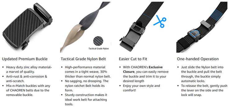 ✦【Exact Fit for Comfort】CHAOREN Ratchet Belt allows for 1/7" micro-adjustments for perfect fit everywhere, higher and easier regulation for an extremely comfortable experience. The innovative removable buckle allows you to cut the nylon belt to your ideal size.