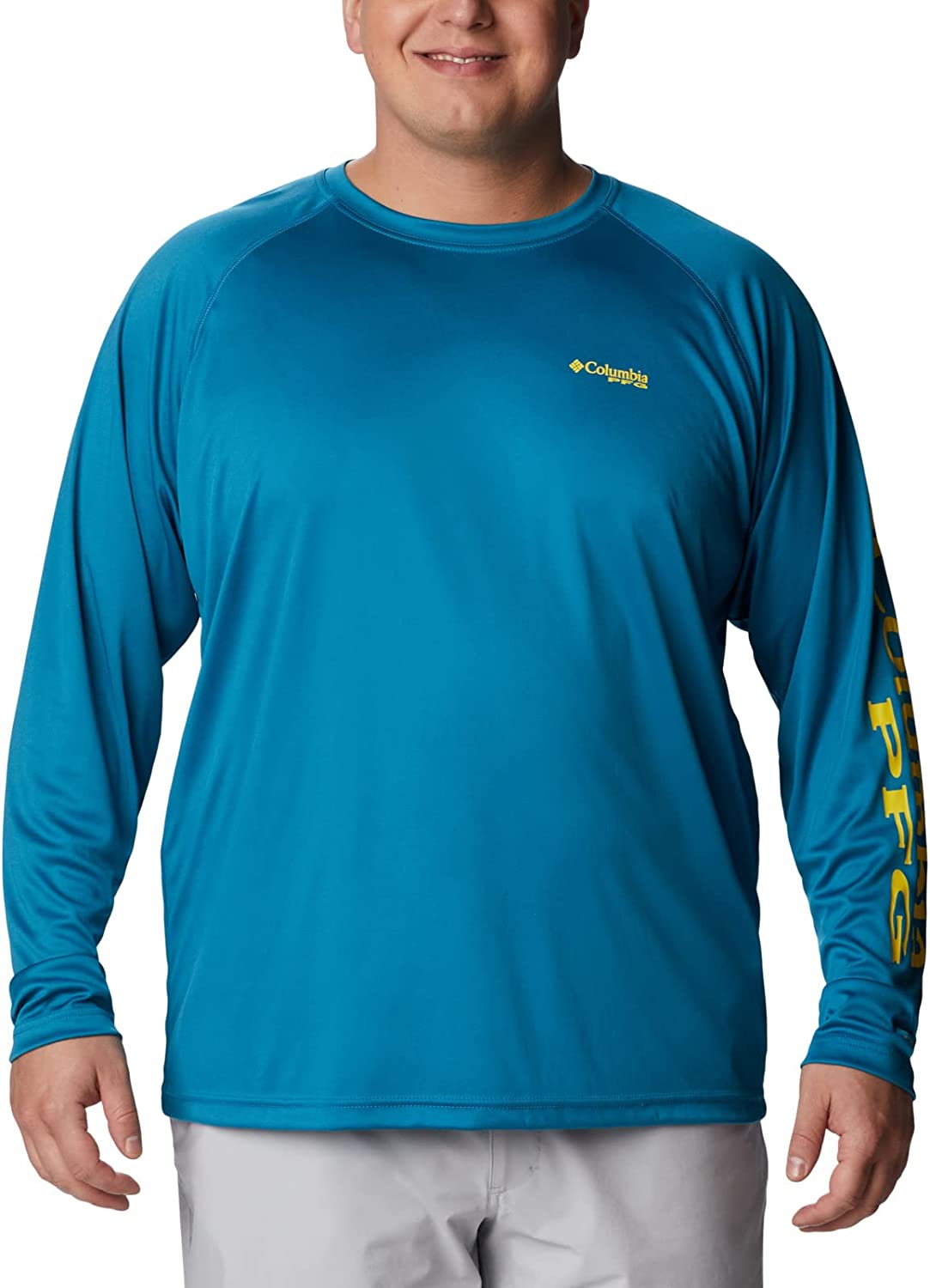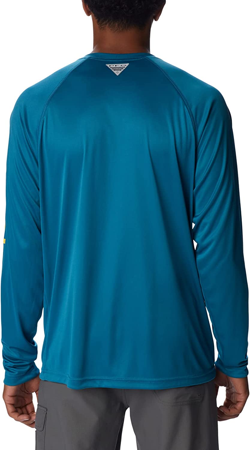 The polyester interlock construction of our PFG Terminal Tackle Long Sleeve Shirt offers full coverage against harmful midday sun with UPF 50 protection. It’s also lightweight and quick drying, making it the perfect solution for staying cool while protecting your skin out over any highly reflective water. It’s the ultimate day-out-on-the-boat staple… lightweight, durable, go-to gear. This technology featured long sleeve Tee is necessity for any day out on the ocean, lake, or river. Made up of a combination of Columbia’s signature protection fabrics: UPF 50 works to block and shield you from harmful UVA and UVB sun rays known to cause skin damage, while the advanced wicking fabric works to pull moisture and water away from the skin. You remain cool while our signature PFG logo runs along the sleeve. Columbia offers this fishing shirt in multiple staple colors and sizes. Available in extended sizing. Regular Fit. To ensure the size you choose is right, utilize our sizing chart and the following measurement instructions: For the sleeves, start at the center back of your neck and measure across the shoulder and down to the sleeve. If you come up with a partial number, round up to the next even number. For the chest, measure at the fullest part of the chest, under the armpits and over the shoulder blades, keeping the tape measure firm and level.
