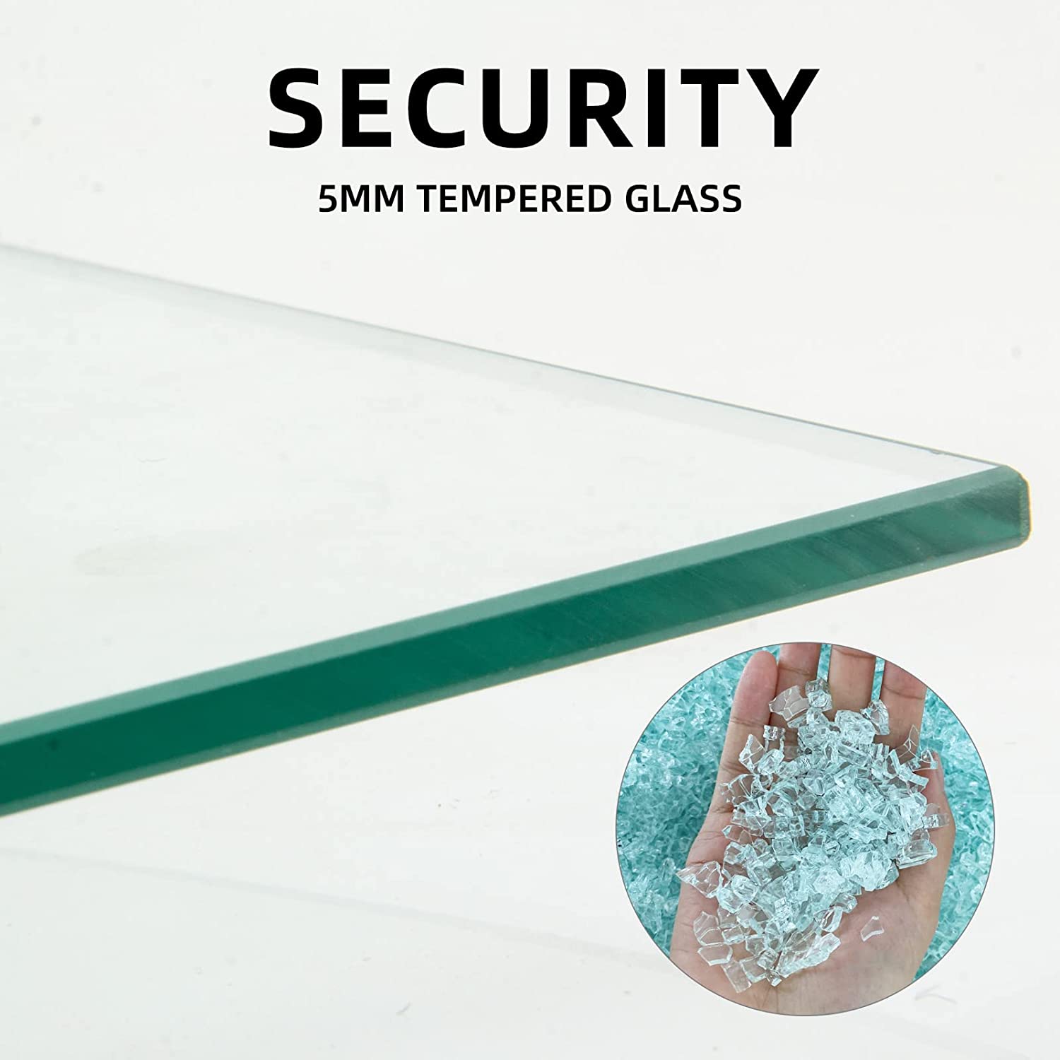Specification: 64.7" (H) x 16.7" (L) x 14" (W).Each tempered glass is 5mm thick. Bearing capacity: Each shelf can hold up to 7.7 lbs. Available colors: Black & White.