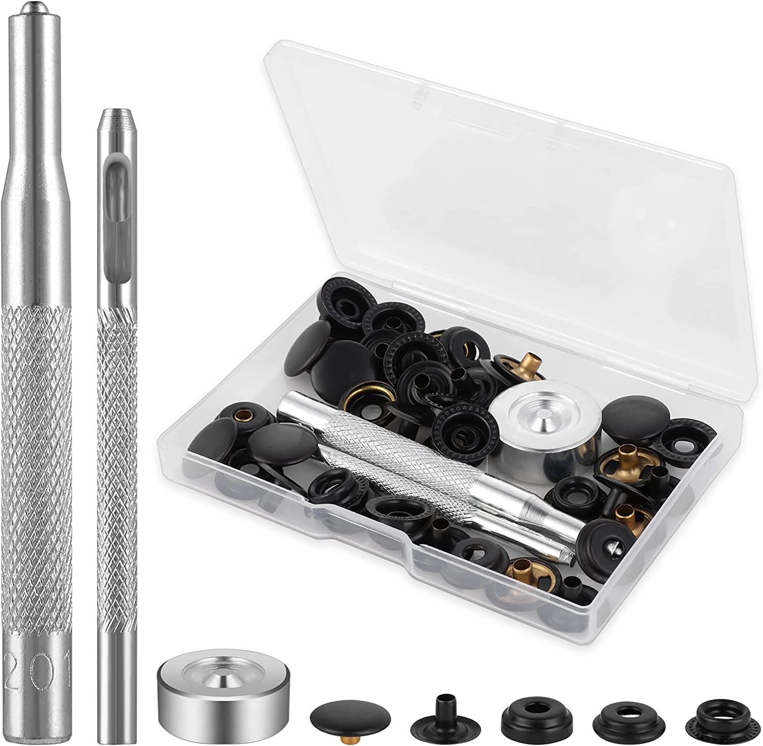 What You Will Receive: package comes with 12 sets of snap faster kits, each set contains 4 small parts, including cap, washer, socket and stud, also comes with 3 pieces installation tools, These will be packaged in a transparent plastic box, convenient for your storage and use.