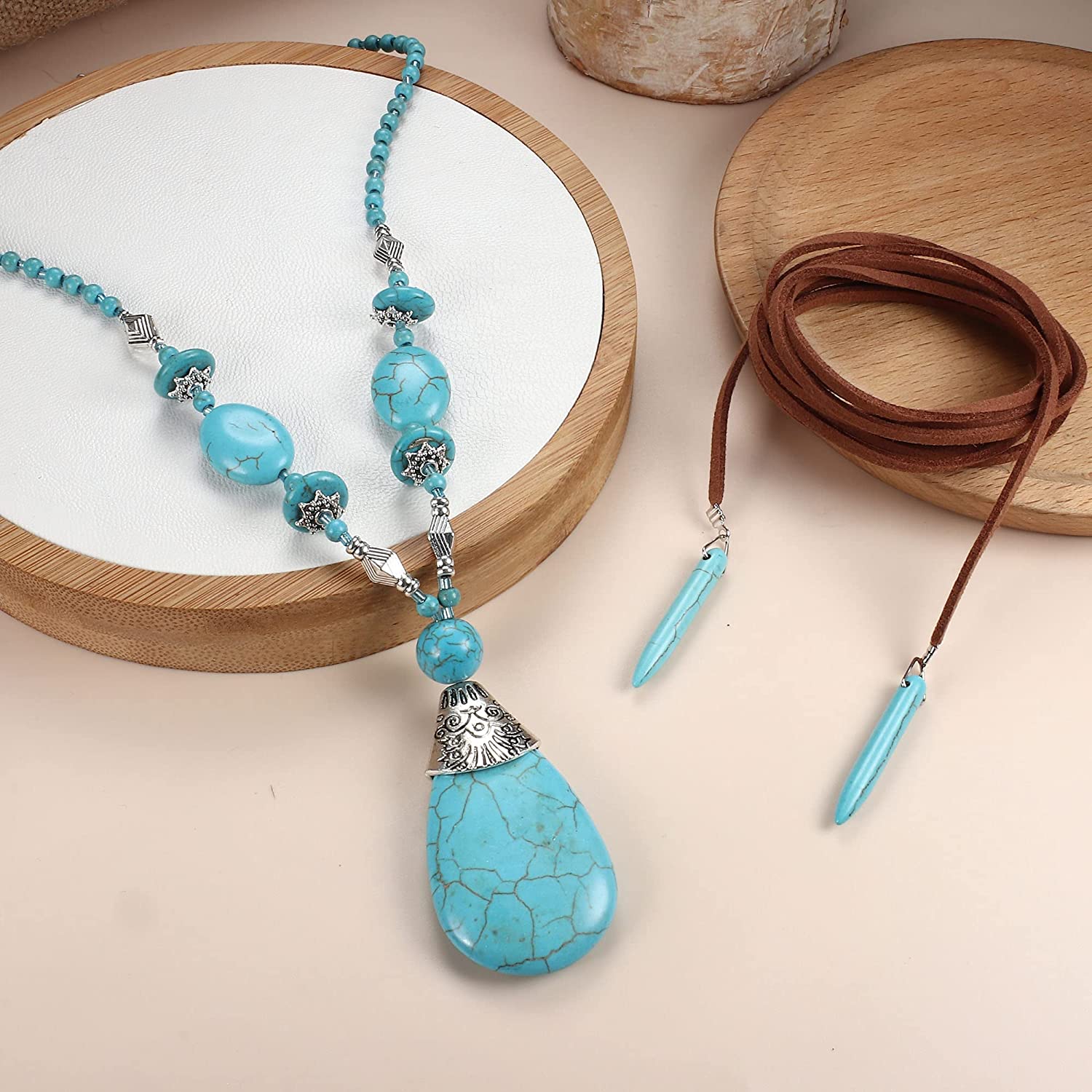 【HIGH QUALITY MATERIALS】Turquoise jewelry set is made of alloy, turquoise and leather, strong, not easy to break, not easy to rust, resistant to oxidation, never change color. Safe material, light weight, high polish, will not hurt the skin, more comfortable to wear. Wearing turquoise jewelry, we believe they will bring you good luck and health.