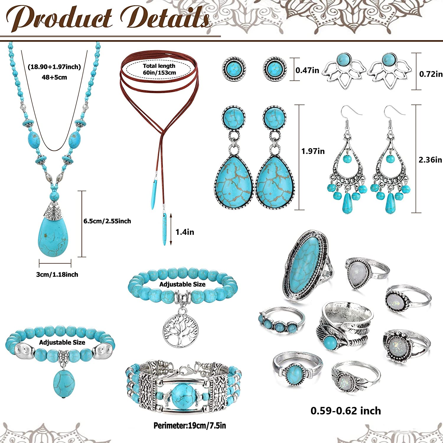 【TURQUOISE JEWELRY SET】Turquoise jewelry set includes 1 piece turquoise pendant necklace and 1 piece boho choker necklace, 1 piece layered turquoise bracelet and 2 piece adjustable turquoise bead bracelet,4 pairs of turquoise earrings and 8 pieces turquoise knuckle rings. Retro and fashion are perfectly combined to create a charming appearance for you.