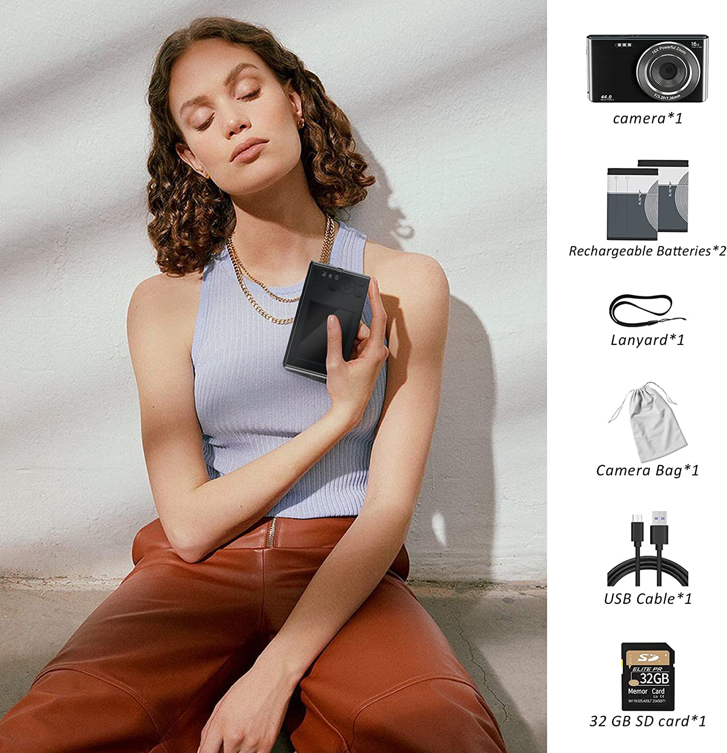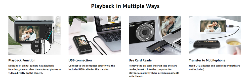 - 【4K & 44MP Digital Camera for Photography】NIKICAM 4k compact photography camera for kids girls boys adults has 4k video resolution and 44MP image resolution, and support 16X digital zoom, helping you capture and record the most exciting memorable moments with high-quality images or videos. This rechargeable digital camera come with a 32GB SD card, just turn the camera on and record the exciting moments wiht your family now!