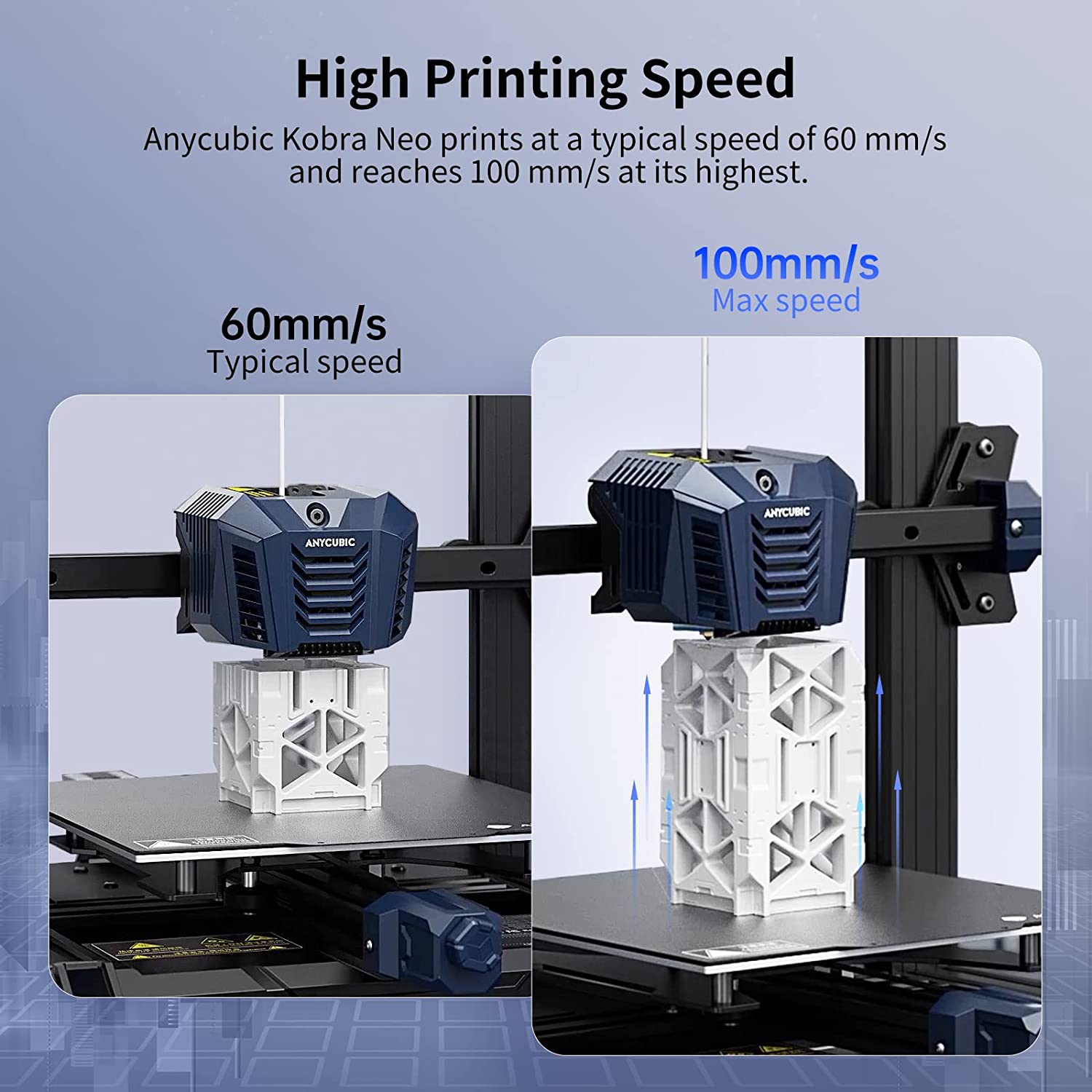 More Function: ①Fast Printing: Anycubic Kobra Neo 3d prints at a typical speed of 60mm/s and reaches 100mm/s at its highest, which will save much time; ②Smart Sensors: The standard power outage resuming sensor and the optional filament run-out sensor reduces filament waste and save time by avoiding the printing failure caused by the power outage and lack of filament.