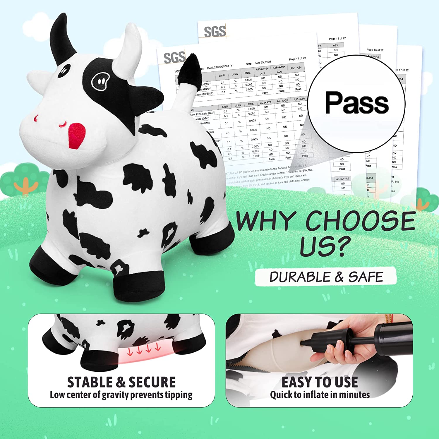 - ECO-FRIENDLY AND SAFE: Our bouncy cow are Phthalates, lead, BPA, and heavy metal-free, making them safe for your child to use. They have been tested for compliance with the ASTM F963-11 Toy Safety Standards, so you can trust that your child is safe while using our animal hopper.
