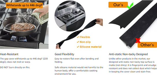 - 【Dust-proof and anti-movement】Our stove gap filler top surface is matte black, It is better to fingerprint and smudge resistant and does not collect dust. The back side is shiny non-slip (tacky) which keep the cover tight in place.