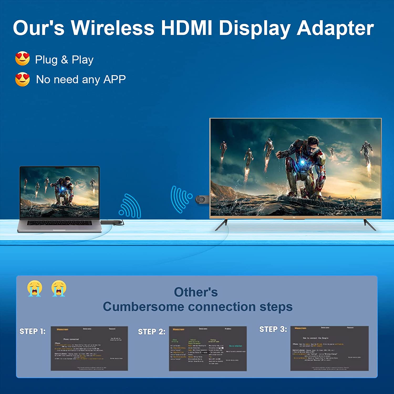 - [Plug & Play] No need any APP, simple connection can get the convenience of wireless streaming media.No software or WiFi connection required. Get up and running in 20 second with a true plug-and-play experience.which solves the problems for the traditional HDMI cable connection and wiring trouble, aesthetics affecting and the short transmission distance. Connect the transmitter to the HDMI source, then connect the receiver to the HDTV/Projector , connect the power, and you are ready to go.
