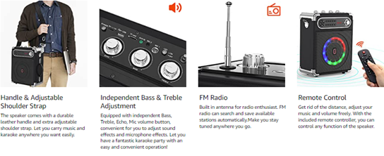 - TWS Mode: By connecting two same big bluetooth speakers, the powerful and stereo sound will be synchronized and surround you by 2 channels. You can enjoy music with the best sense of presence, power and volume. (NOTE: If you are not satisfied with this karaoke speaker or have any other questions, please feel free to contact us before return. we promise to offer you satisfactory solutions.)