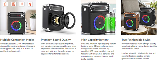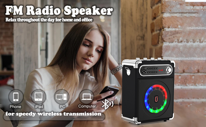 The product has a built in Bluetooth 5.0 provide the more stable transmission and longer distance, Works with all of your favorite devices like iPhone, Android mobile phone, iPad, Tablet, PC, no cables needed , Great for churches, small parties, schools, class rooms, gyms, corporate meetings & presentaions
