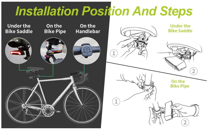 | Mounting Type | on the bike pipe / under the bike saddle |